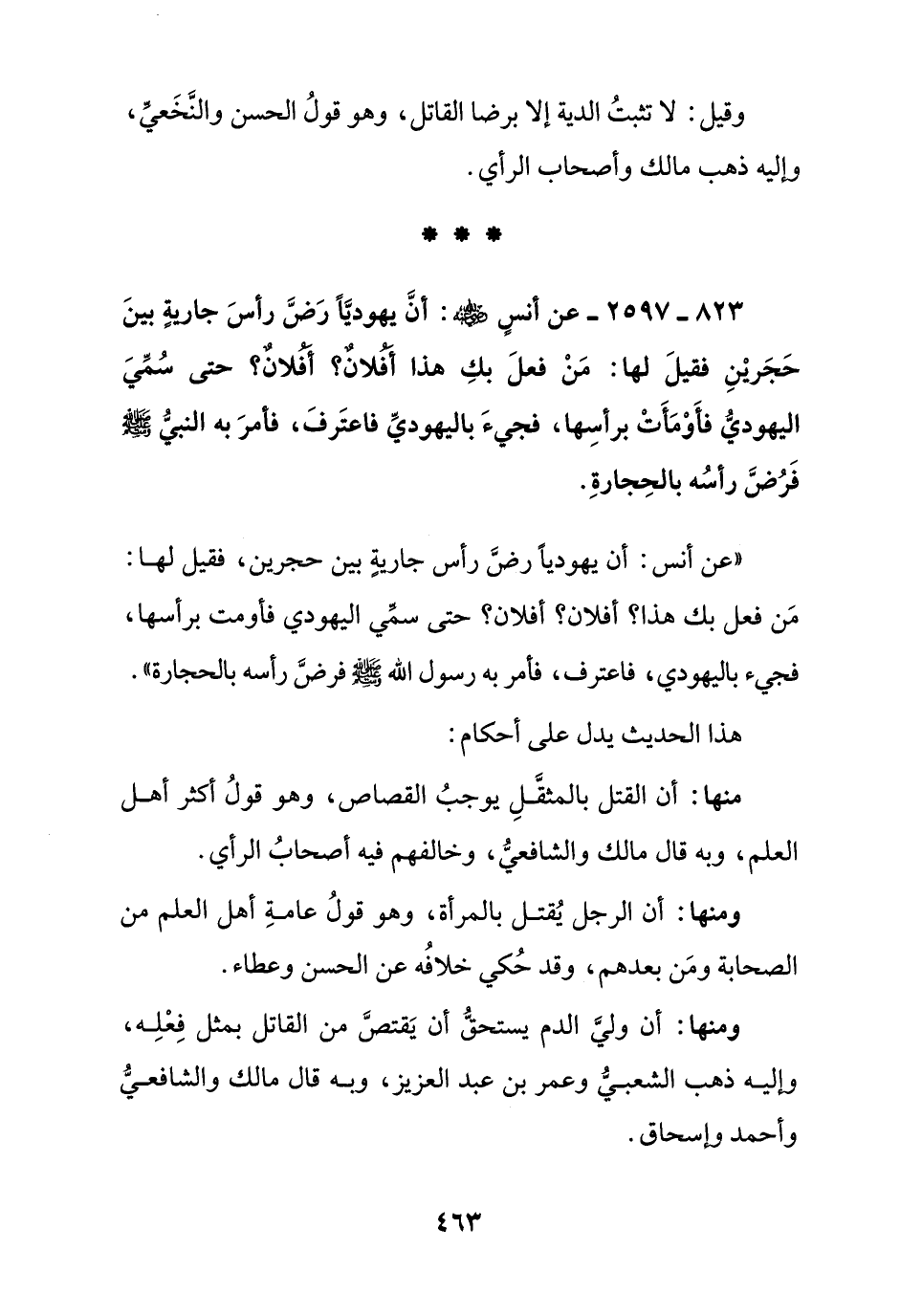 823 - 2597 - عن أنس رضي الله عنه: أن يهوديا رض رأس جارية بين حجرين فقيل لها: من فعل بك هذا أفلان؟ أفلان؟ حتى سمي اليهودي فأومأت برأسها, فجيء باليهودي فاعترف, فأمر به النبي صلى الله عليه وسلم فرض رأسه بالحجارة ".