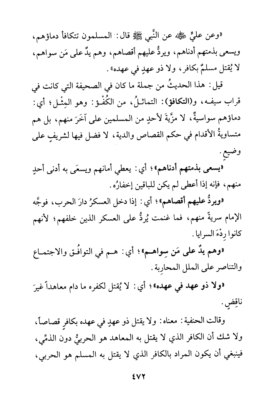 " وعن علي رضي الله عنه عن النبي صلى الله عليه وسلم قال: المسلمون تتكافأ دماؤهم ويسعى بذمتهم أدناهم, ويرد عليهم أقصاهم, وهم يد على من سواهم, لا يقتل مسلم بكافر, ولا ذو عهد في عهده ".