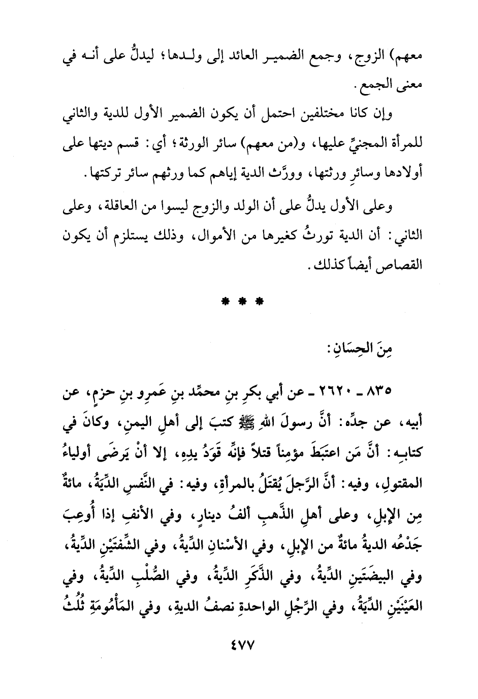 835 - 2620 - عن أبي بكر بن محمد بن عمرو بن حزم, عن أبيه عن جده: أن رسول الله صلى الله عليه وسلم كتب إلى أهل اليمن, وكان في كتابه: أن من اعتبط مؤمنا قتلا فإنه قود يده, إلا أن يرضى أولياء المقتول, وفيه: أن الرجل يقتل بالمرأة, وفيه: في النفس الدية, مائة من الإبل وعلى أهل الذهب ألف دينار, وفي الألف إذا أوعب جدعه الدية مائة من افبل, وفي الأسنان الدية, وفي الشفتين الدية, وفي البيضتين الدية, وفي الذكر الدية, وفي الصلب الدية, وفي العينين الدية, وفي الرجل الواحدة نصف الدية, وفي المأمومة ثلث