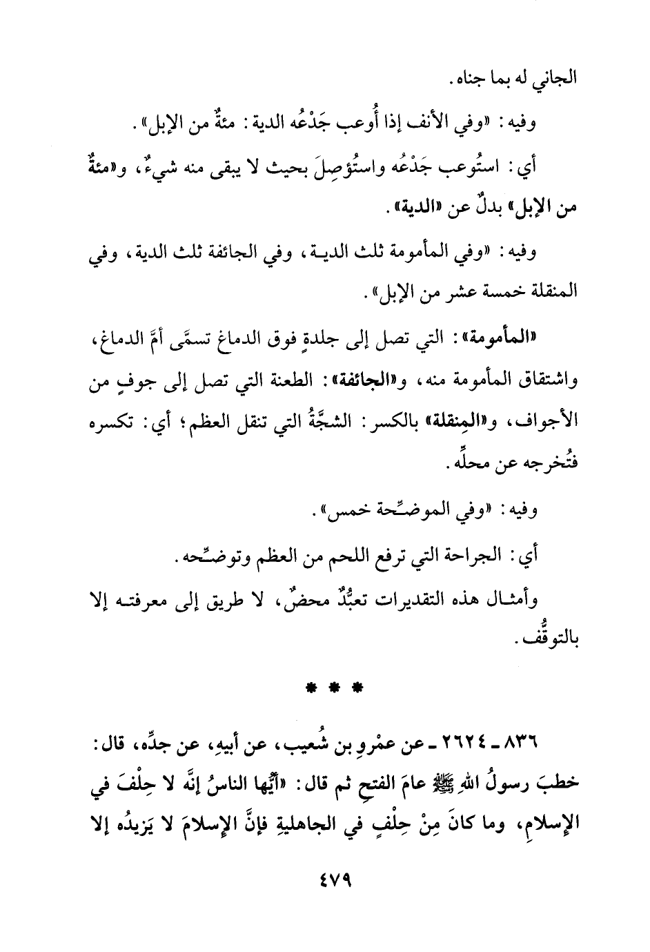 " المأمومة ": التي تصل إلى جلدة فوق الدماغ تسمى أم الدماغ, واشتقاق المأمومة منه, و" الجائفة ": الطعنة التي تصل إلى جوف من الأجواف و" المنقلة " بالكسر: الشجة التي تنقل العظم, أي: تكسره فتخرجه عن محله.