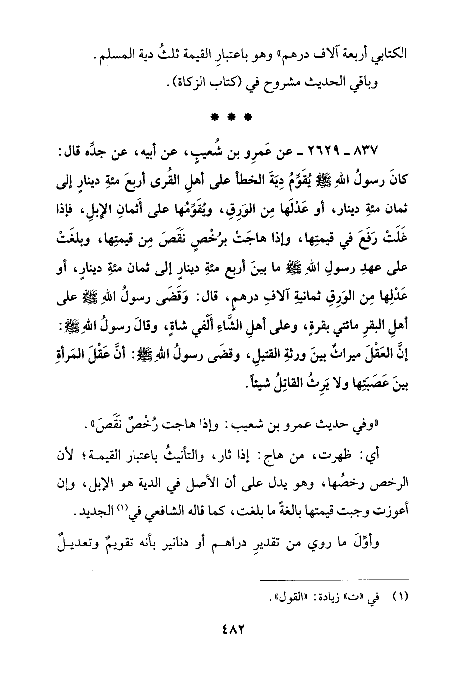 837 - 2629 - عن عمرو بن شعيب عن أبيه عن جده قال: كان رسول الله صلى الله عليه وسلم يقوم دية الخطأ على أهل القرى أربع مئة دينار إلى ثمان مئة دينار, أو عدلها من الورق, ويقومها على أثمان الإبل, فإذا غلت رفع في قيمتها, وإذا هاجت برخص نقص من قيمتها, وبلغت على عهد رسول الله صلى الله عليه وسلم ما بين أربع مئة دينار إلى ثمان مئة دينار, أو عدلها من الورق ثمانية آلاف درهم, قال: وقضى رسول الله صلى الله عليه وسلم على أهل البقر مائتي بقرة, وعلى أهل الشاء ألفي شاة, وقال رسول الله صلى الله عليه وسلم: إن العقل ميراث بين ورثة القتيل, وقضى رسول الله صلى الله عليه وسلم: أن عقل المرأة بين عصبتها ولا يرث القاتل شيئا "