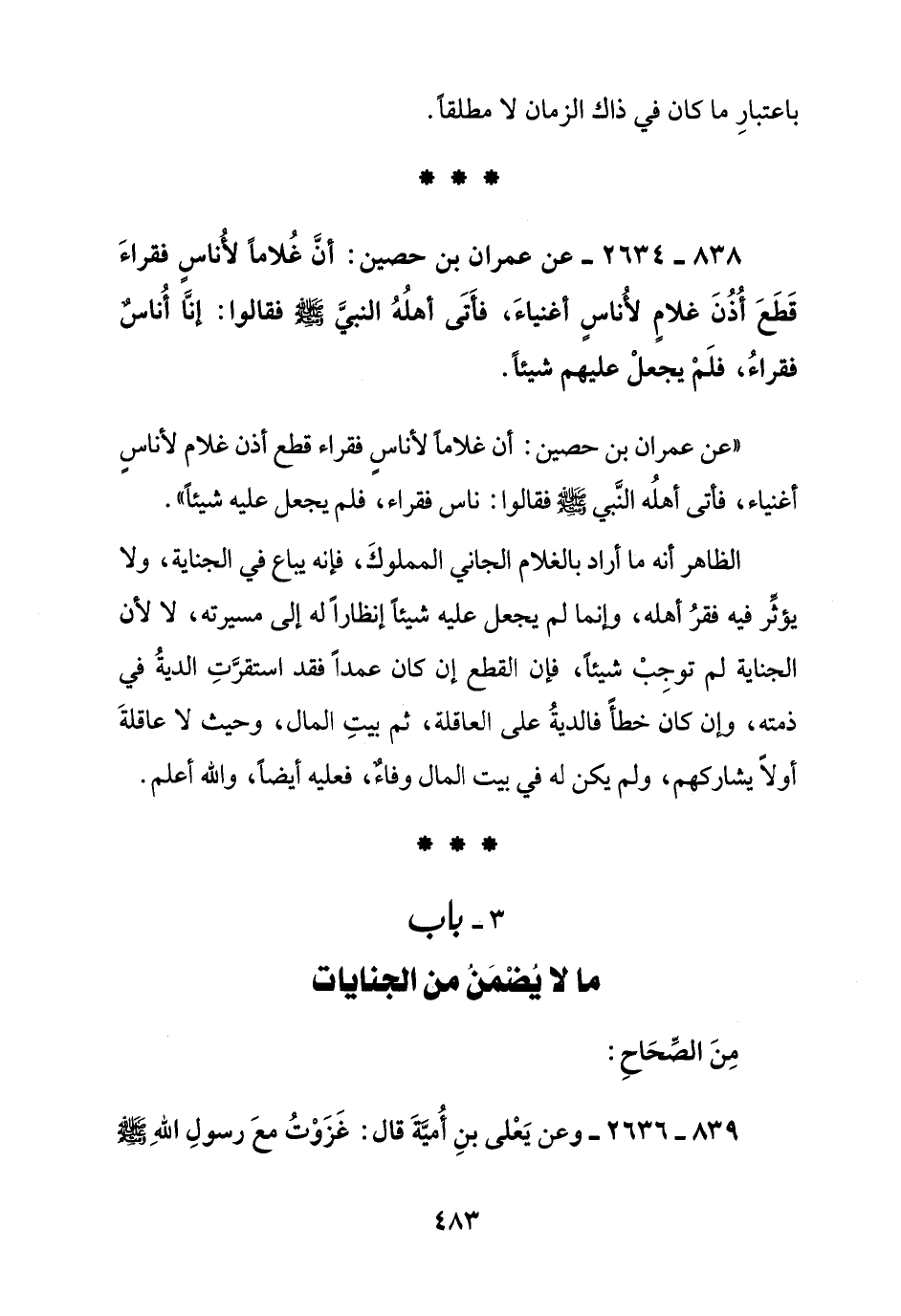 838 - 2634 - عن عمران بن حصين: أن غلاما لأناس فقراء قطع أذن غلام لأناس أغنياء, فأتى أهله النبي صلى الله عليه وسلم فقالوا: إنا أناس فقراء, فلم يجعل عليهم شيئا "