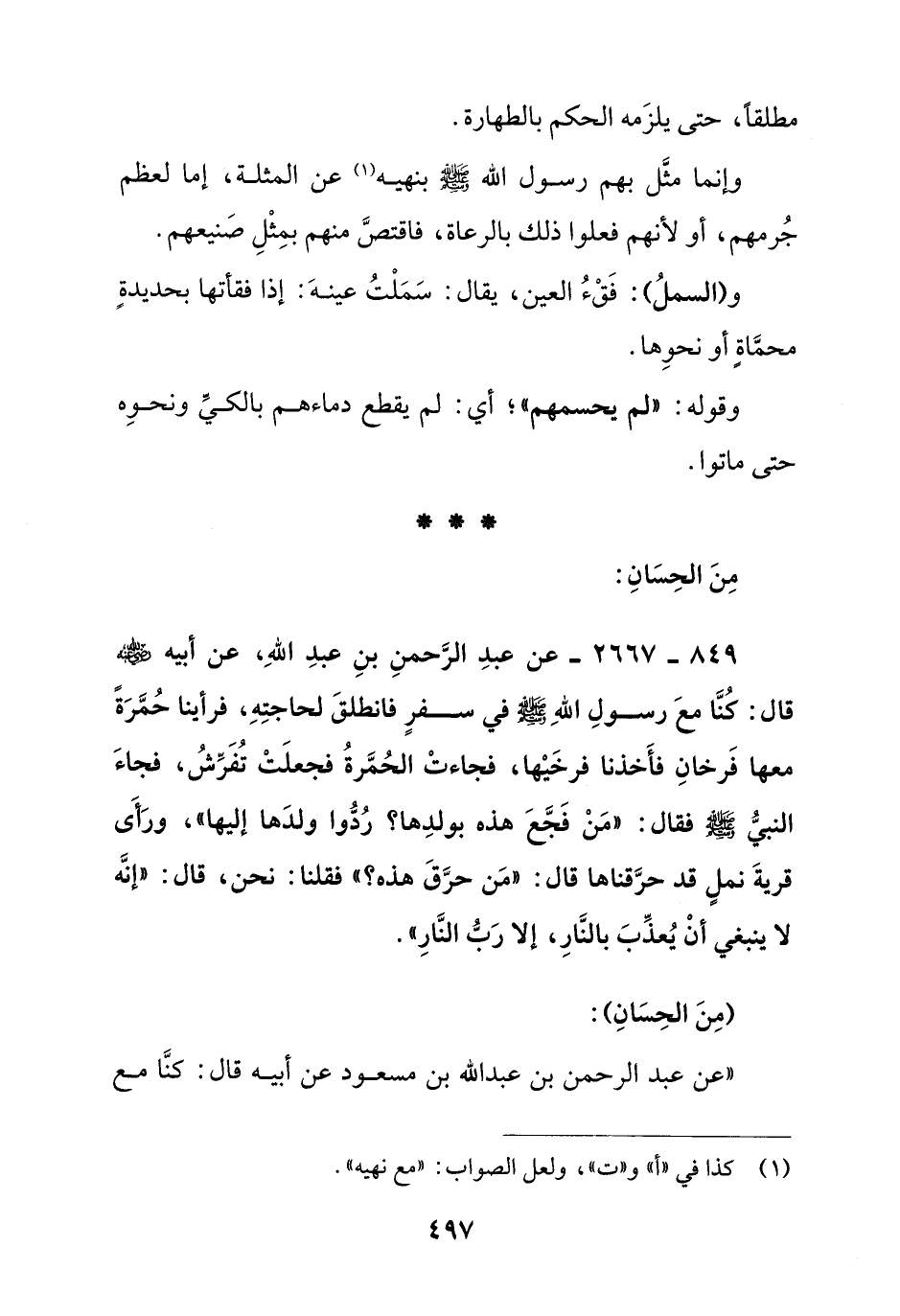849 – 2667 – عن عبد الرحمن بن عبد الله عن أبيه رضي الله عنه قال: كنا مع رسول الله صلى الله عليه وسلم في سفر فانطلق لحاجته, فرأينا حمرة معها فرخان فأخذنا فرخيها, فجاءت الحمرة فجعلت تفرش, فجاء النبي صلى الله عليه وسلم فقال: " من فجع هذه بولدها " ردوا ولدها إليها " ورأى قرية نما قد حرقناها قال: " من حرق هذه؟ " فقلنا: نحن, قال: " إنه لا ينبغي أن يعذب بالنار إلا رب النار".