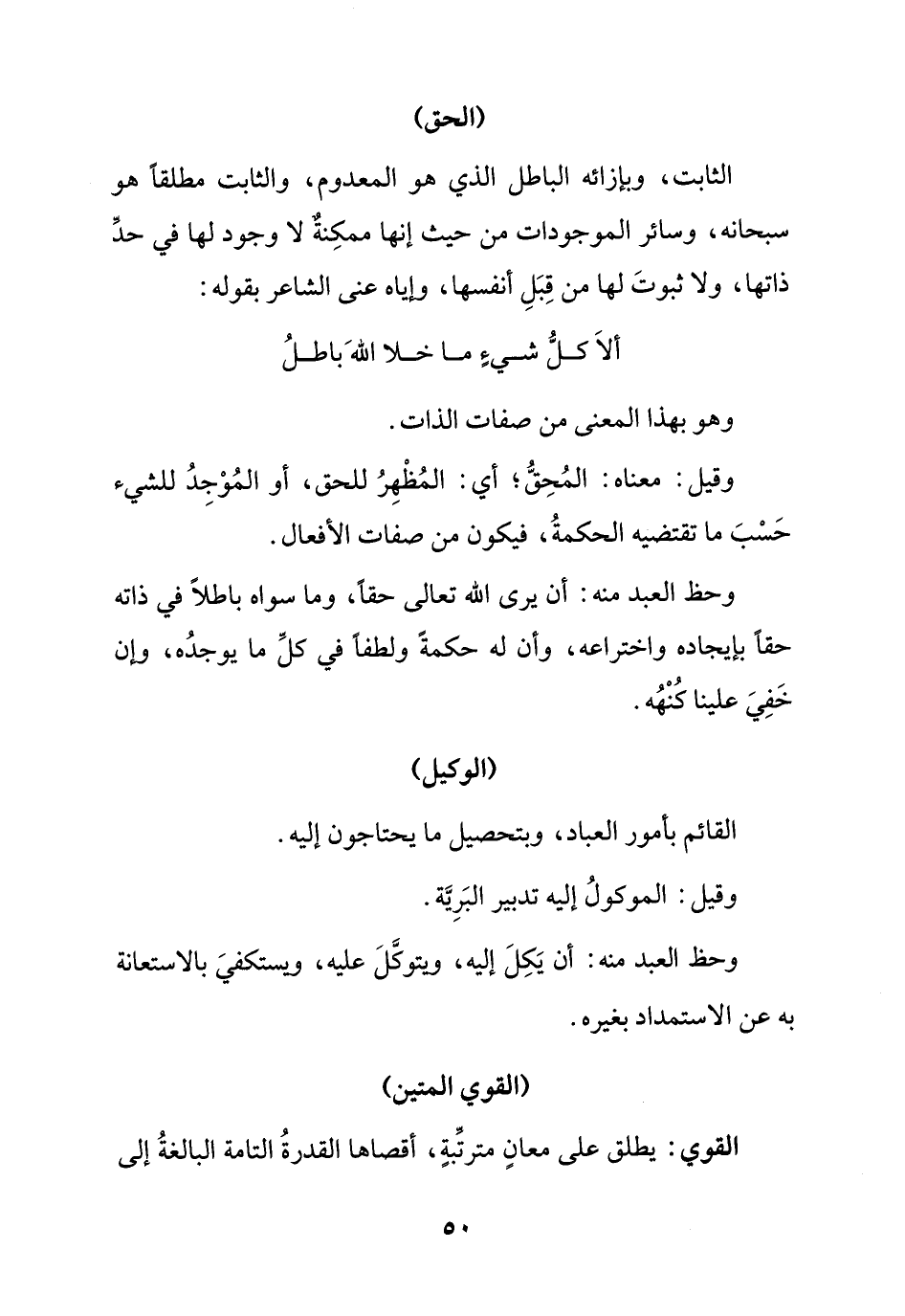 وحظ العبد منه: أن يرى الله تعالى حقا, وما سواه باطلا في ذاته حقا بإيجاده واختراعه, وأن له حكمة ولطفا في كل ما يوجده, وإن خفي علينا كنهه.