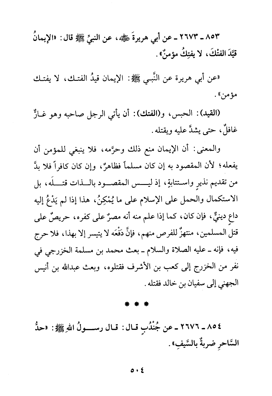 854 – 2676 – عن جندب قال: قال رسول الله صلى الله عليه وسلم: "حد الساحر ضربة بالسيف".