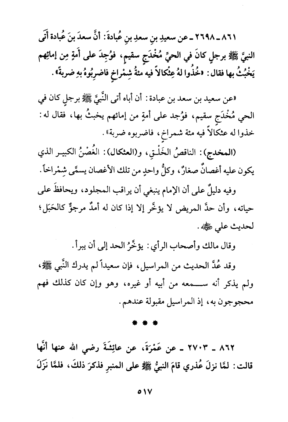 861 - 2698 - عن سعيد بن سعد بن عبادة: أن سعد بن عبادة أتى النبي صلى الله عليه وسلم برجل كان في الحي مخدج سقيم, فوجد على أمة من إمائهم يخبث بها فقال: " خذوا له عثكالا فيه مئة شمراخ فاضربوه به ضربة "