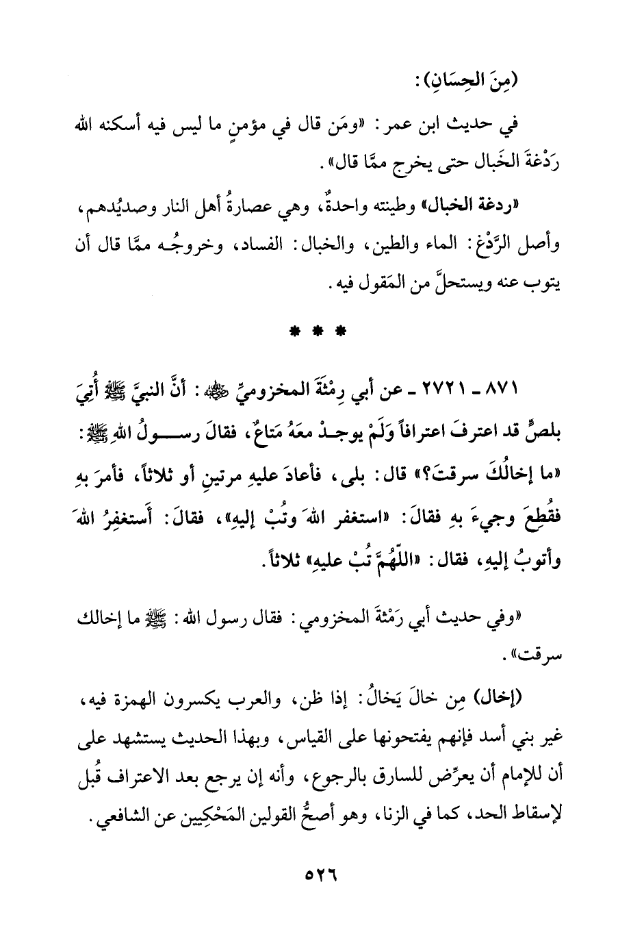871 - 2721 - عن أبي رمثة المخزومي رضي الله عنه: أن النبي صلى الله عليه وسلم أتي بلص قد اعترف اعترافا ولم يوجد معه متاع, فقال رسول الله صلى الله عليه وسلم: " ما إخالك سرقت؟ " قال: بلى, فأعاد عليه مرتين أو ثلاثا, فأمر به فقطع وجيء به فقال: " استغفر الله وتب إليه " فقال: أستغفر الله وأتوب إليه, فقال: " اللهم تب عليه " ثلاثا.
