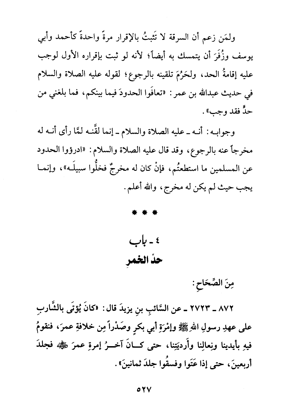 872 - 2723 - عن السائب بن يزيد قال: " كان يؤتى بالشارب على عهد رسول الله صلى الله عليه وسلم وإمرة أبي بكر وصدرا من خلافة عمر, فنقوم فيه بأيدينا ونعالنا وأرديتنا, حتى كان آخر إمرة عمر رضي الله عنه فجلد أربعين, حتى إذا عتوا وفسقوا جلد ثمانين ".