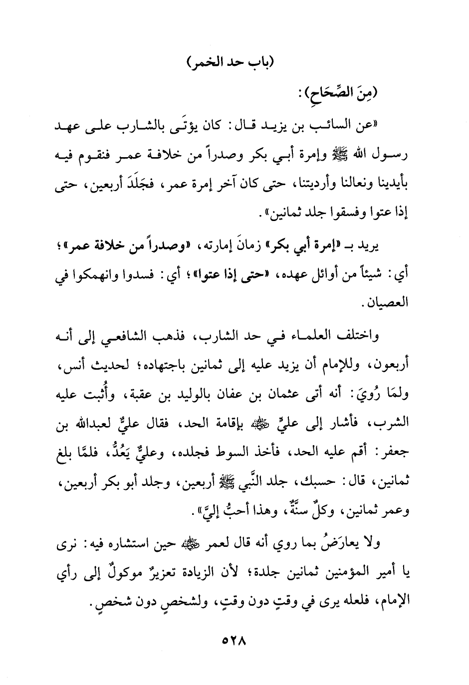 " عن السائب بن يزيد قال: كان يؤتى بالشارب على عهد رسول الله صلى الله عليه وسلم وإمرة أبي بكر وصدرا من خلافة عمر فنقوم فيه بأيدينا ونعالنا وأرديتنا, حتى كان آخر إمرة عمر, فجلد أربعين, حتى إذا عتوا وفسقوا جلد ثمانين ".