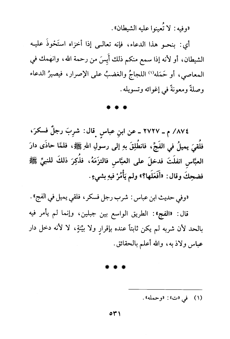 874 / م - 2727 - عن ابن عباس قال: شرب رجل فسكر, فلقي يميل في الفج, فانطلق به إلى رسول الله صلى الله عليه وسلم, فلما حاذى دار العباس انفلت فدخل على العباس فالتزمه, فذكر ذلك للنبي صلى الله عليه وسلم فضحك وقال: " أفعلها؟ " ولم يأمر فيه بشيء.