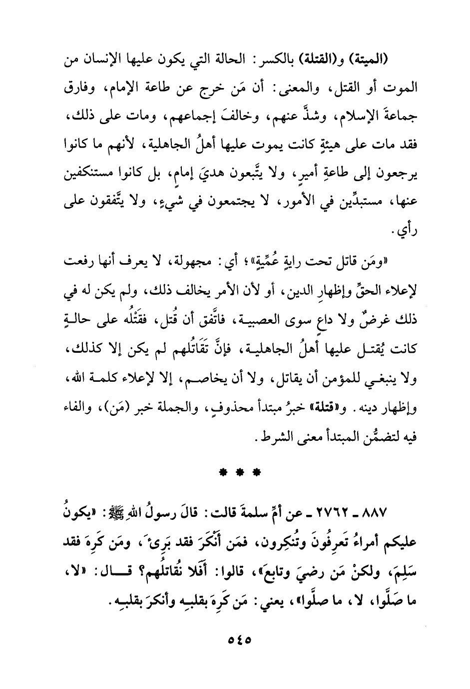 887 - 2762 - عن أم سلمة قالت: قال رسول الله صلى الله عليه وسلم: " يكون عليكم أمراء تعرفون وتنكرون, فمن أنكر فقد بريء, ومن كره فقد سلم, ولكن من رضي وتابع " وقالوا: أفلا نقاتلهم؟ قال: " لا, ما صلوا, لا, ما, صلوا " يعني: من كره بقلبه وأنكر بقلبه ".
