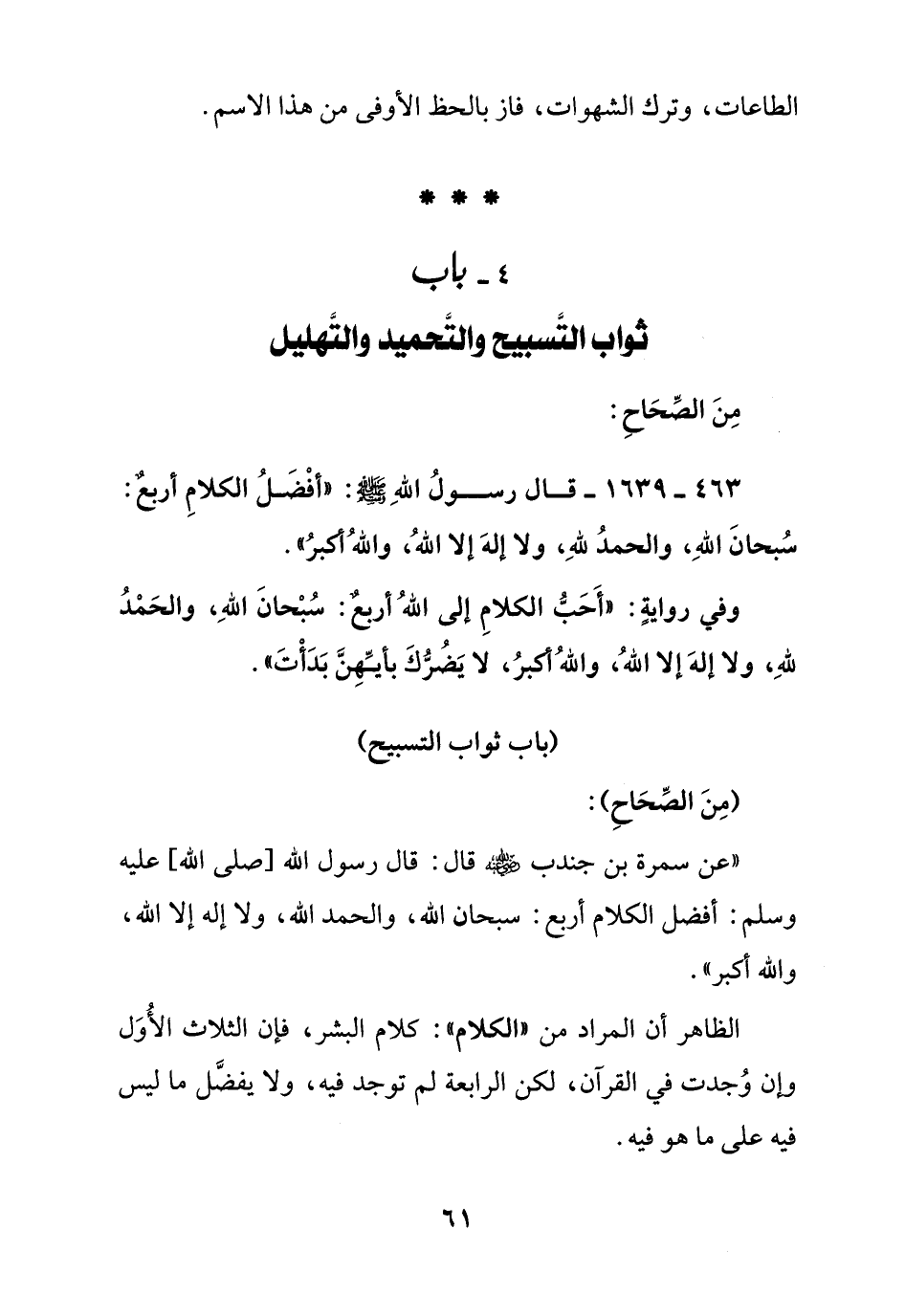 463 - 1639 - قال رسول الله صلى الله عليه وسلم: " أفضل الكلام أربع: سبحان الله, والحمد لله, ولا إله إلا الله, والله أكبر ".