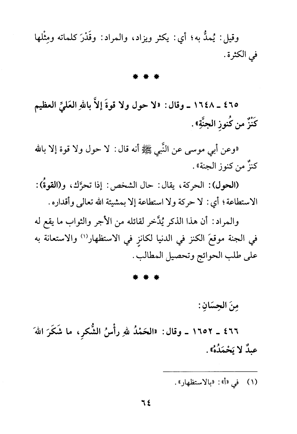 465 - 1648 - وقال:" لا حول ولا قوة إلا بالله العلي العظيم كنز من كنوز الجنة ".