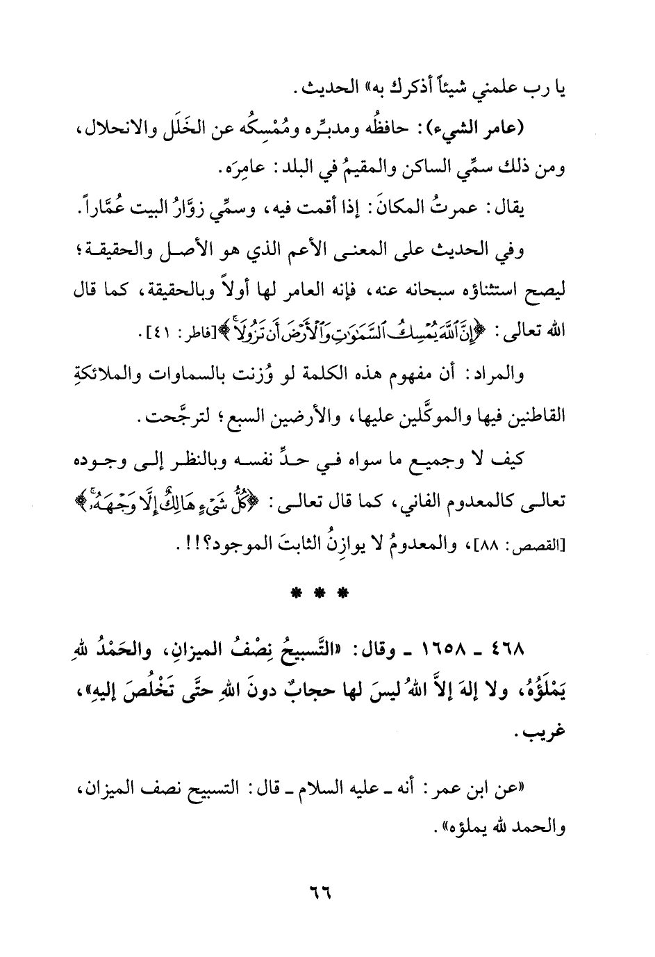468 - 1658 - وقال: " التسبيح نصف الميزان والحمد لله يملؤه, ولا إله إلا الله ليس لها حجاب دون الله حتى تخلص إليه " غريب.