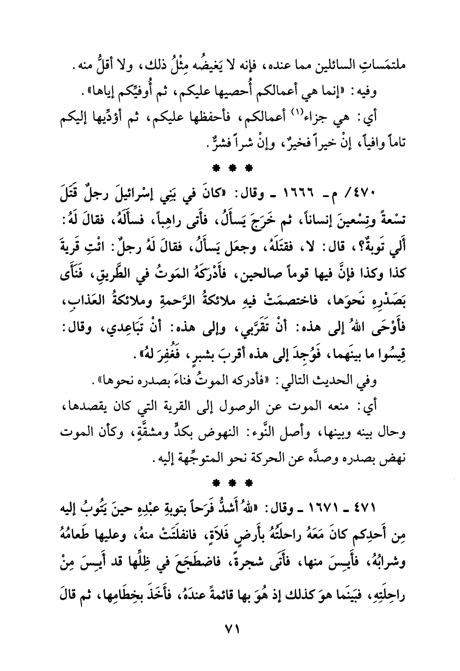 470 /م – 1666 – وقال: " كان في بني إسرائيل رجل قتل تسعة وتسعين إنسانا, ثم خرج يسأل, فأتى راهبا فسأله, فقال له: ألي توبة؟ قال: لا فقتله, وجعل يسأل, فقال له رجل: ائت قرية كذا وكذا فإن فيها قوما صالحين, فأدركه الموت في الطريق, فنأى بصدره نحوها, فاختصمت فيه ملائكة الرحمة وملائكة العذاب, فأوحى الله إلى هذه: أن تقربي, وإلى هذه: أن تباعدي, وقال: قيسوا ما بينهما, فوجد إلى هذه أقرب بشبر, فغفر له ".