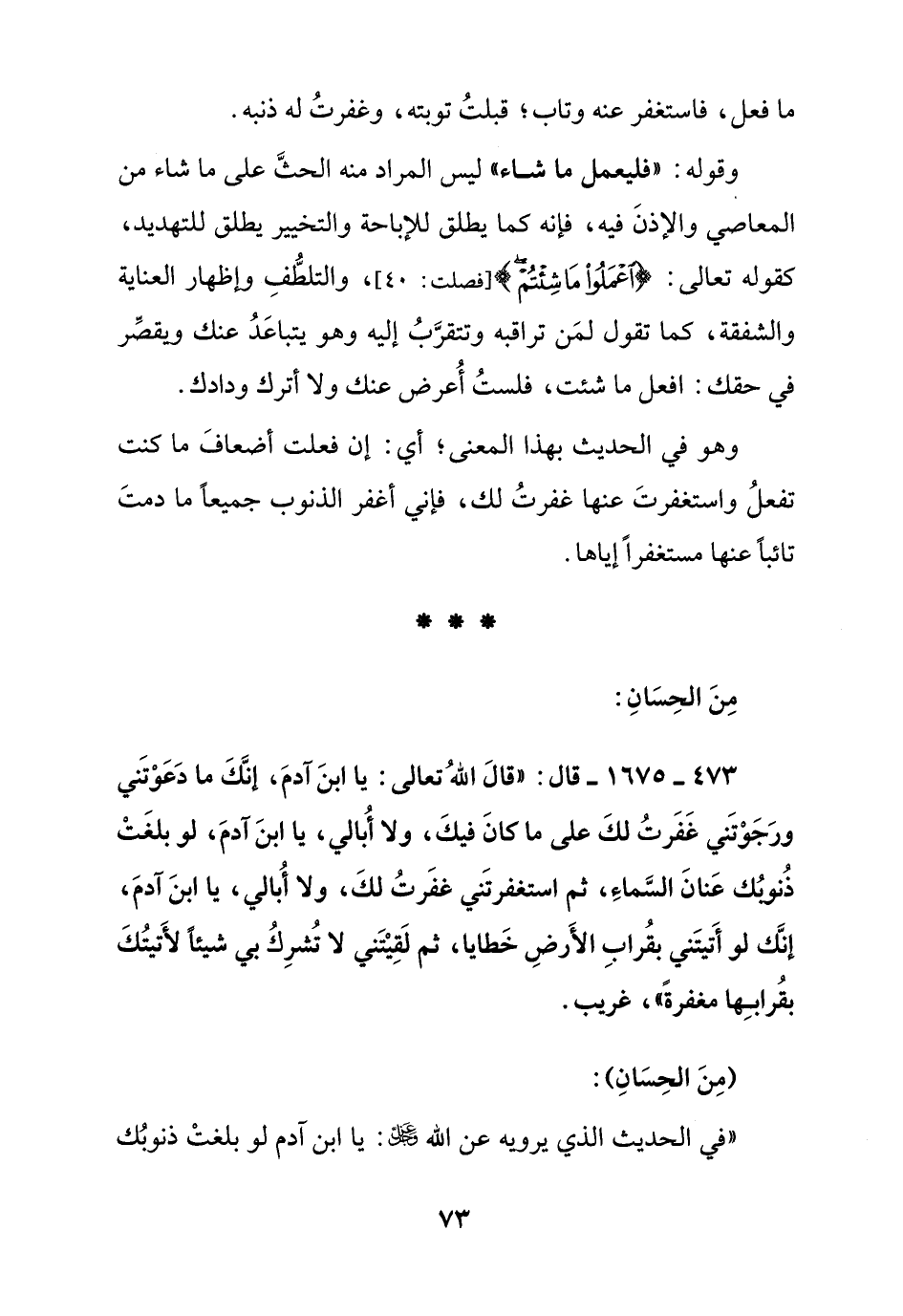 473 – 1675 – قال: " قال الله تعالى: يا ابن آدم, إنك ما دعوتني ورجوتني غفرت لك على ما كان فيك, ولا أبالي, يا ابن آدم, لو بلغت ذنوبك عنان السماء, ثم استغفرتني غفرت لك, ولا أبالي, يا ابن آدم, إنك لو أتيتني بقراب الأرض خطايا, ثم لقيتني لا تشرك بي شيئا لأتيتك بقرابها مغفرة ". غريب.
