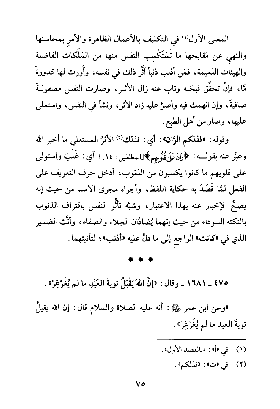 المعنى الأول في التكليف بالأعمال الظاهرة والأمر بمحاسنها والنهي عن مقابحها ما تستكسب النفس منها من الملكات الفاضلة والهيئات الذميمة, فمن أذنب ذنبا أثر ذلك في نفسه, وأورث لها كدورة ما, فإن تحقق قبحه وتاب عنه زال الأثر, وصارت النفس مصقولة صافية, وإن انهمك فيه وأصر عليه زاد الأثر, ونشأ في النفس, واستعلى عليها, وصار من أهل الطبع.