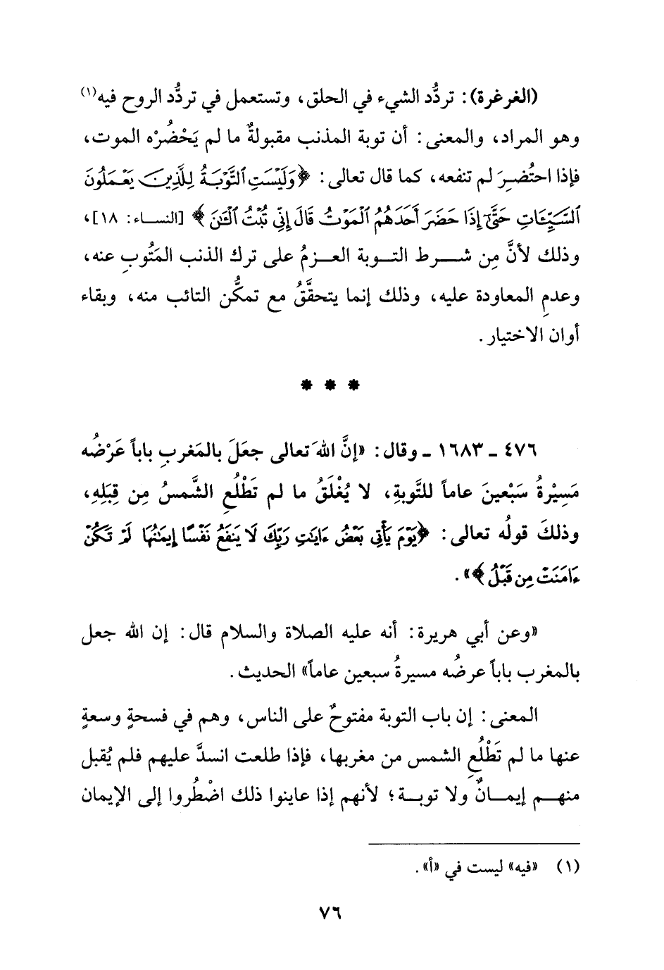 476 – 1683 – وقال: " إن الله تعالى جعل بالمغرب بابا عرضه مسيرة سبعين عاما للتوبة, لا يغلق ما لم تطلع الشمس من قبله, وذلك قوله تعالى: {يوم يأتي بعض آيات ربك لا ينفع نفسا إيمانها لم تكن آمنت من قبل} ".