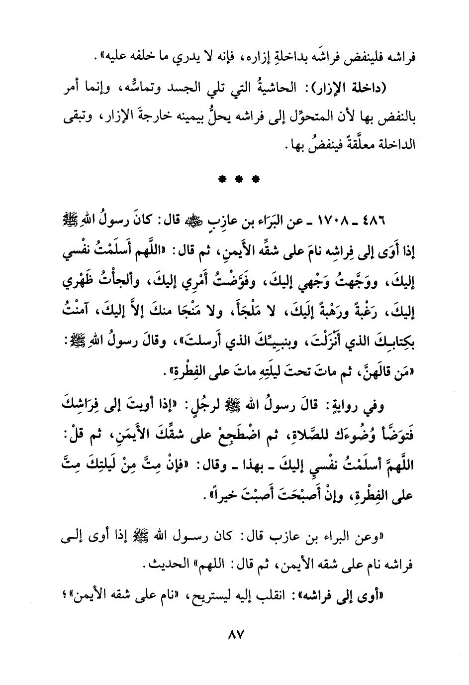 486 – 1708 – عن البراء بن عازب رضي الله عنه قال: كان رسول الله صلى الله عليه وسلم إذا أوى إلى فراشه نام على شقه الأيمن, ثم قال: " اللهم أسلمت نفسي إليك, ووجهت وجهي إليك, وفوضت أمري إليك, وألجأت ظهري إليك, رغبة ورهبة إليك, لا ملجأ, ولا منجا منك إلا إليك, آمنت بكتابك الذي أنزلت, وبنيبيك الذي أرسلت, وقال رسول الل صلى الله عليه وسلم:" من قالهن, ثم مات تحت ليلته مات على الفطرة ".