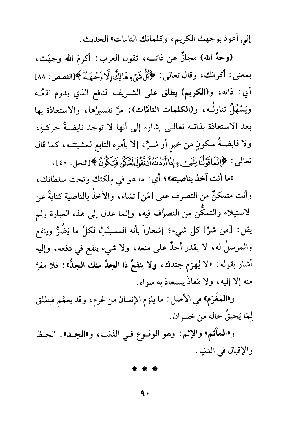 (وجه الله) مجاز عن ذاته, تقول العرب: أكرم الله وجهك, بمعنى: أكرمك, وقال تعالى: {كل شيء هالك إلا وجهه} [القصص: 88] أي: ذاته, و (الكريم) يطلق على الشريف النافع الذي يدوم نفعه ويسهل تناوله, و (الكلمات التامات): مر تفسيرها, والإستعاذة بها بعد الاستعاذة بذاته تعالى إشارة إلى أنها لا توجد نابضة حركة, ولا قابضة سكون من خير أو شر, إلا بأمره التابع لمشيئته, كما قال تعالى: {إنما قولنا لشيء إذا أردناه أن نقول له كن فيكون} [النحل: 40].