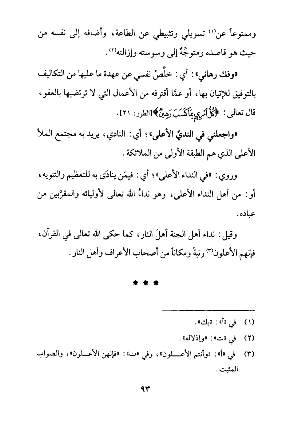 " واجعلني في الندي الأعلى " أي: النادي يريد به مجتمع الملأ الأعلى الذي هم الطبقة الأولى من الملائكة.