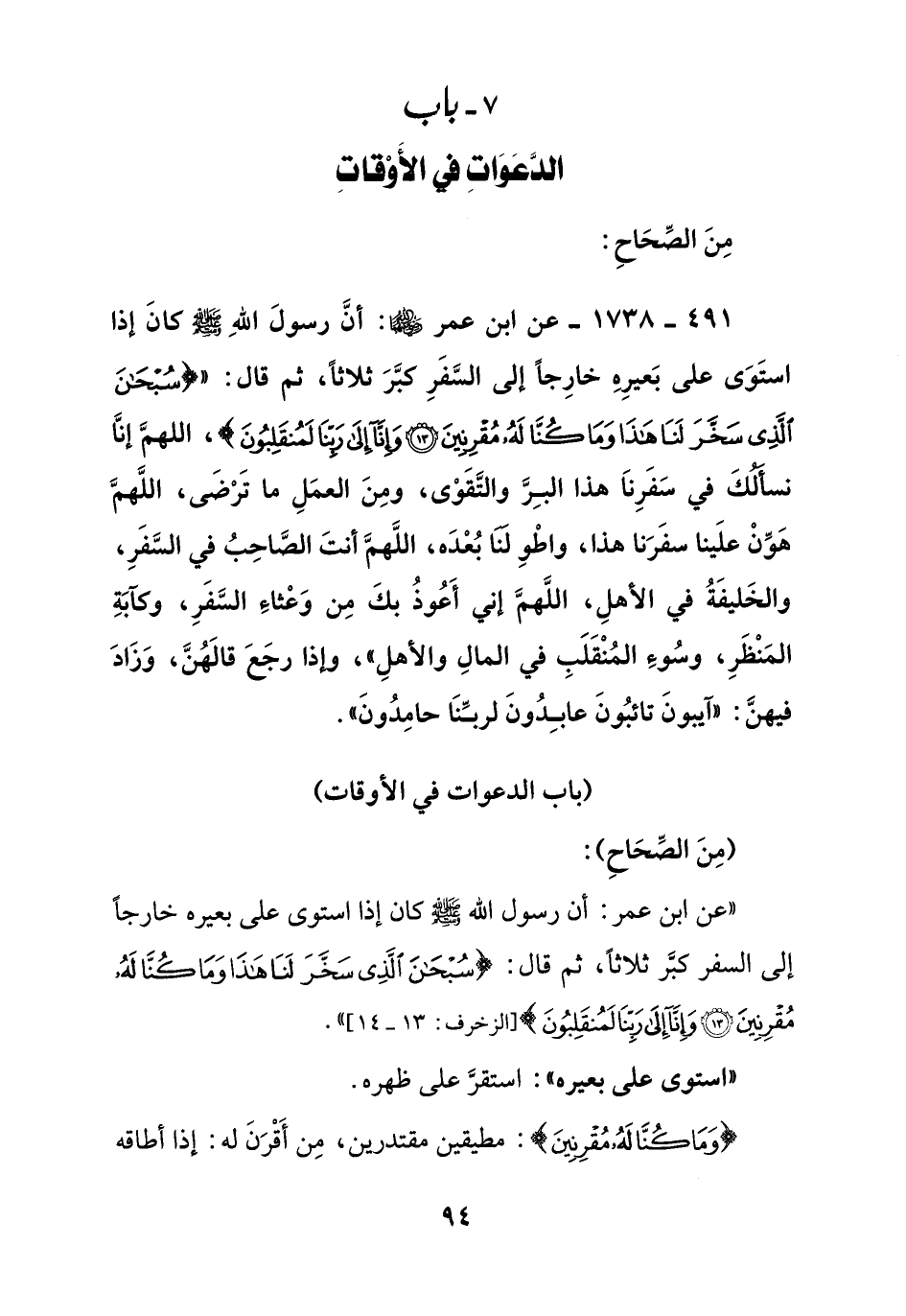 491 - 1738 - عن ابن عمر رضي الله عنهما: أن رسول الله صلى الله عليه وسلم كان إذا استوى على بعيره خارجا إلى السفر كبر ثلاثا, ثم قال: {سبحان الذي سخر لنا هذا وما كنا له مقرنين * وإنا إلى ربنا لمنقلبون} , اللهم إنا نسألك في سفرنا هذا البر والتقوى ومن العمل ما ترضى , اللهم هون علينا سفرنا هذا, واطو عنا بعده, اللهم أنت الصاحب في السفر, والخليفة في الأهل, اللهم إني أعوذ بك من وعثاء السفر, وكآبة المنظر, وسوء المنقلب في المال والأهل " وإذا رجع قالهن وزاد فيهن: " آيبون تائبون عابدون لربنا حامدون ".