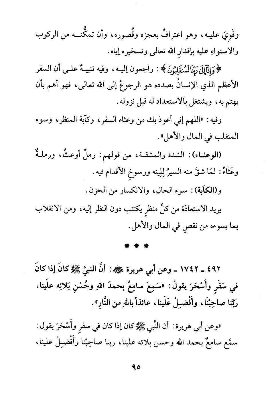 492 - 1742 - وعن أبي هريرة رضي الله عنه: أن النبي صلى الله عليه وسلم كان إذا كان ف سفر وأسحر يقول: " سمع سامع بحمد الله وحسن بلائه علينا, ربنا صلحبنا, وأفضل علينا, عائذا بالله من النار ".