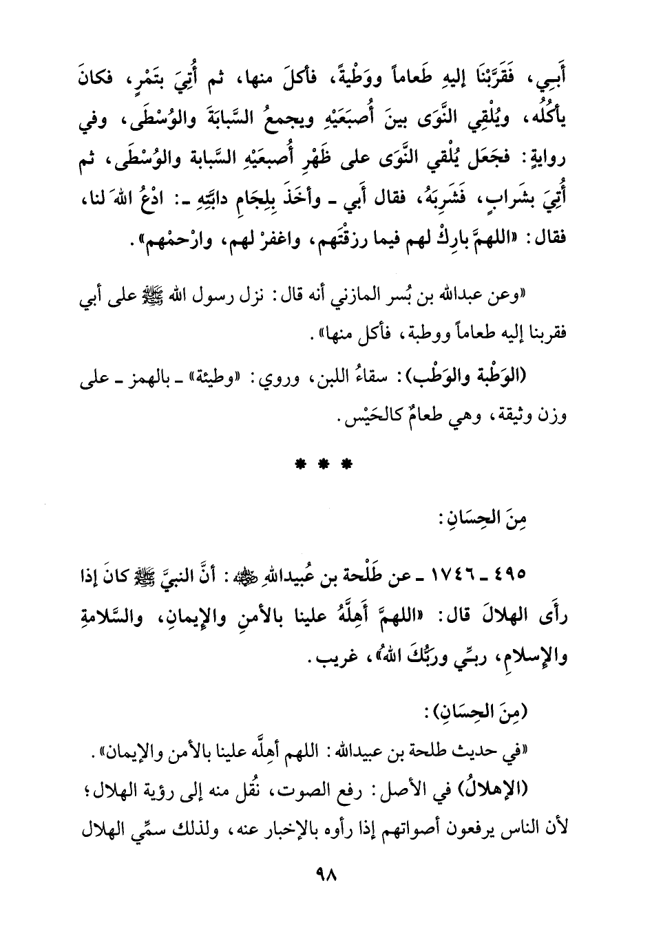 495 - 1746 - عن طلحة بن عبيد الله رضي الله عنه: أن النبي صلى الله عليه وسلم كان إذا رأى الهلال قال:: اللهم أهله علينا بالأمن والإيمان, والسلامة والإسلام, ربي وربك الله " غريب.