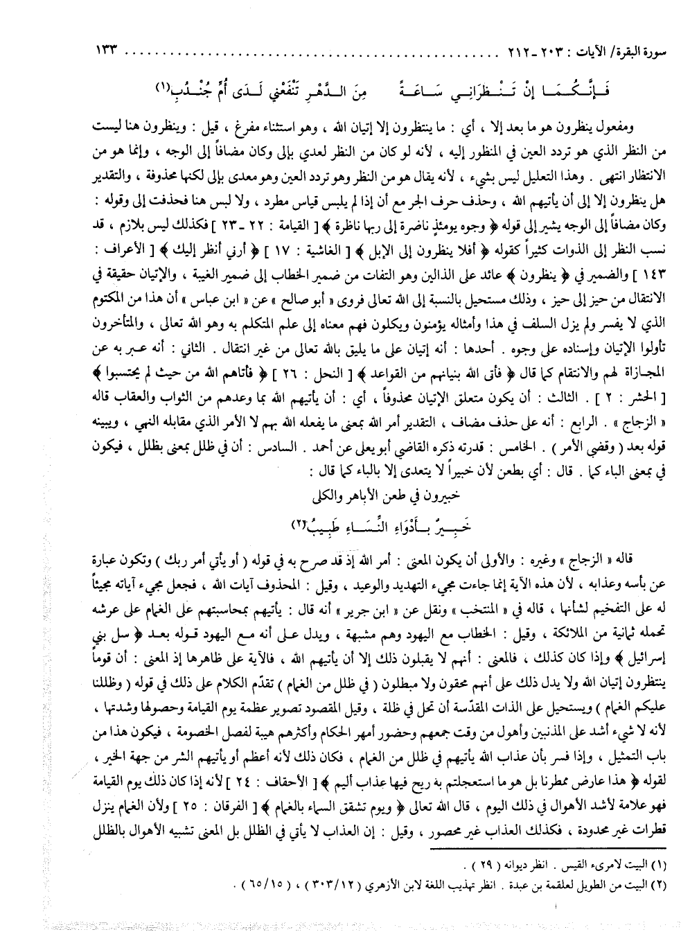 وهذا التعليل ليس بشيء لأنه يقال : هو من النظر ، وهو تردد العين . وهو معدى بإلى ، لكنها محذوفة ، والتقدير : هل ينظرون إلاَّ إلى أن يأتيهم الله ؟ وحذف حرف الجر مع أن إذا لم يلبس قياس مطرد ، ولا لبس هنا ، فحذفت إلى ، وقوله : وكان مضافاً إلى الوجه يشير إلى قوله : ) وُجُوهٌ يَوْمَئِذٍ نَّاضِرَةٌ إِلَى رَبّهَا نَاظِرَةٌ ( فكذلك ليس بلازم ، قد نسب النظر إلى الذوات كثيراً كقوله : ) أَفَلاَ يَنظُرُونَ إِلَى الإبِلِ ( ) أَرِنِى أَنظُرْ إِلَيْكَ ( والضمير في : ينظرون ، عائد على الذالين ، وهو التفات من ضمير الخطاب إلى ضمير الغيبة .