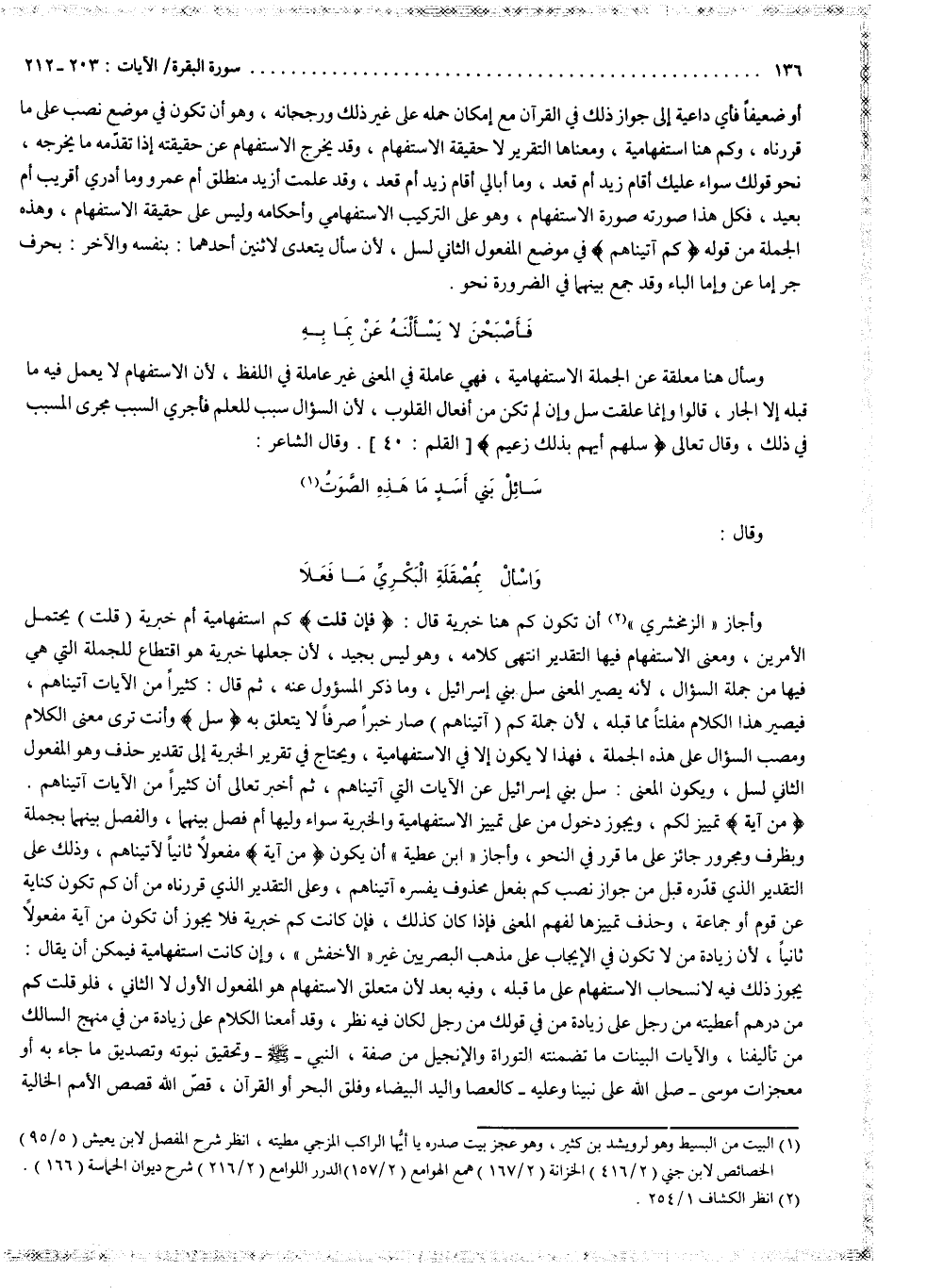 و : سأل ، هنا معلقة عن الجملة الاستفهامية ، فهي عاملة في المعنى ، غير عاملة في اللفظ ، لأن الإستفهام لا يعمل فيه ما قبله إلاَّ الجار ، قالوا : وإنما علقت : سل ، وإن لم تكن من أفعال القلوب ، لأن السؤال سبب للعلم ، فأجرى السبب مجرى المسبب في ذلك ، وقال تعالى : ) سَلْهُمْ أَيُّهُم بِذالِكَ زَعِيمٌ ( وقال الشاعر .