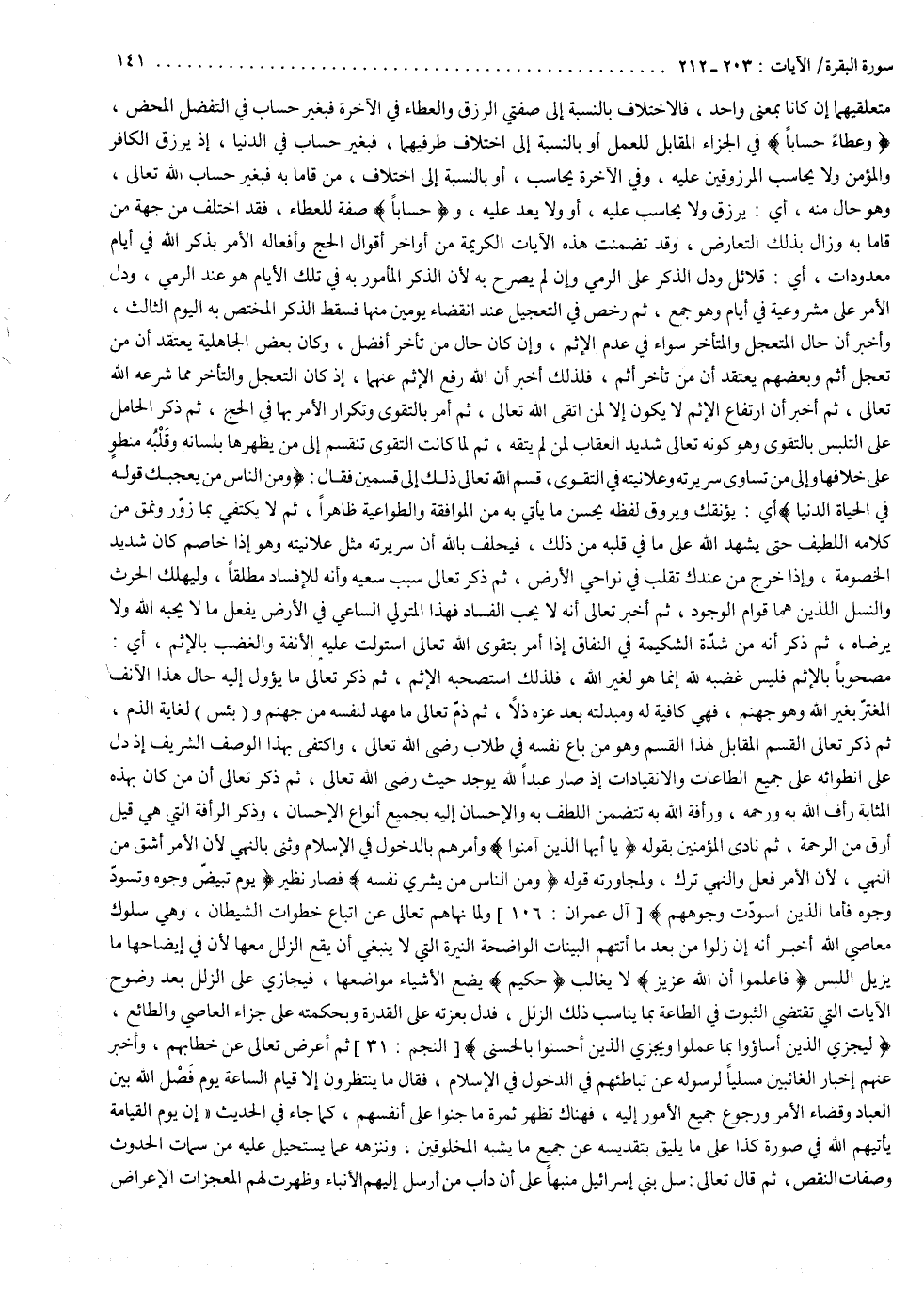 ثم أمر بالتقوى ، وتكرار الأمر بها في الحج ، ثم ذكر الحامل على التلبس بالتقوى ، وهو كونه تعالى شديد العقاب لمن لم يتقه ، ثم لما كانت التقوى تنقسم إلى من يظهرها بلسانه وقلبه منطو على خلافها ، وإلى من تساوى سريرته وعلانيته في التقوى ، قسم الله تعالى ذلك إلى قسمين ، فقال : ) وَمِنَ النَّاسِ مَن يُعْجِبُكَ قَوْلُهُ فِى الْحَيَواةِ الدُّنْيَا ( أي : يؤنقك ويروق لفظه ، يحسن ما يأتي به من الموافقة والطواعية ظاهراً ، ثم لا يكتفي بما زوّر ونمق من كلامه اللطيف حتى يشهد الله على ما في قلبه من ذلك ، فيحلف بالله أن سريرته مثل علانيته ، وهو إذا خاصم كان شديد الخصومة ، وإذا خرج من عندك تقلب في نواحي الأرض ، ثم ذكر تعالى سبب سعيه وأنه للإفساد مطلقاً ، وليهلك الحرث والنسل اللذين هما قوام الوجود ، ثم أخبر تعالى أنه لا يحب الفساد ، فهذا المتولي الساعي في الأرض يفعل ما لا يحبه الله ولا يرضاه ، ثم ذكر أنه من شدّة الشكيمة في النفاق إذا أمر بتقوى الله تعالى استولت عليه الأنفة والغضب بالإثم . أي : مصحوباً بالإثم فليس غضبه لله . إنما هو لغير الله ، فلذلك استصحبه الإثم .