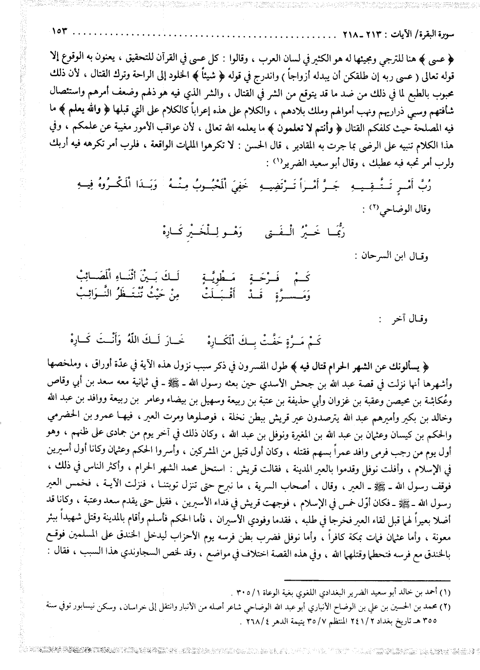 ( يَسْئَلُونَكَ عَنِ الشَّهْرِ الْحَرَامِ قِتَالٍ فِيهِ ( ؟ طوّل المفسرون في ذكر سبب نزول هذه الآية في عدّة أوراق ، وملخصها وأشهرها : أنها نزلت في قصة عبد الله بن جحش الأسدي حين بعثه رسول الله ( صلى الله عليه وسلم ) ) في ثمانية معه : سعد بن أبي وقاص ، وعكاشه بن محيصن ، وعقبة بن غزوان ، وأبي حذيفة بن عتبة بن ربيعة ، وسهيل بن بيضاء ، ووافد بن عبد الله ، وخال بن بكير ، وأميرهم عبد الله يترصدون عير قريش ببطن نخلة ، فوصلوها ، ومرت العير فيها عمرو بن الحضرمي ، والحكم بن كيسان ، وعثمان بن عبد الله بن المغيرة ، ونوفل بن عبد الله ، وكان ذلك في آخر يوم من جمادى على ظنهم ، وهو أوّل يوم من رجب ، فرمى وافد عمراً بسهم فقتله ، وكان أول قتيل من المشركين ، وأسروا الحكم ، وعثمان ، وكانا أوّل أسيرين في الإسلام ، وأفلت نوفل ، وقدموا بالعير المدينة ، فقالت قريش : استحل محمد الشهر الحرام ، وأكثر الناس في ذلك ، فوقف رسول الله ( صلى الله عليه وسلم ) ) العير ، وقال أصحاب السرية : ما نبرج حتى تنزل توبتنا ، فنزلت الآية ، فخمَّس العيرَ رسولُ الله ( صلى الله عليه وسلم ) ) ، فكان أوّل خمس في الإسلام . ، فوجهت قريش في فداء الأسيرين فقيل : حتى يقدم سعد وعتبة ، وكانا قد أضلا بعيراً لهما قبل لقاء العير فخرجا في طلبه ، فقد ما ، وفودي الأسيران . فأما الحكم فأسلم وأقام بالمدينة وقتل شهيداً ببئر معونة ، وأما عثمان فمات بمكة كافراً ، وأما نوفل فضرب بطن فرسه يوم الأحزاب ليدخل الخندق على المسلمين ، فوقع بالخندق مع فرسه ، فتحطما وقتلهما الله .