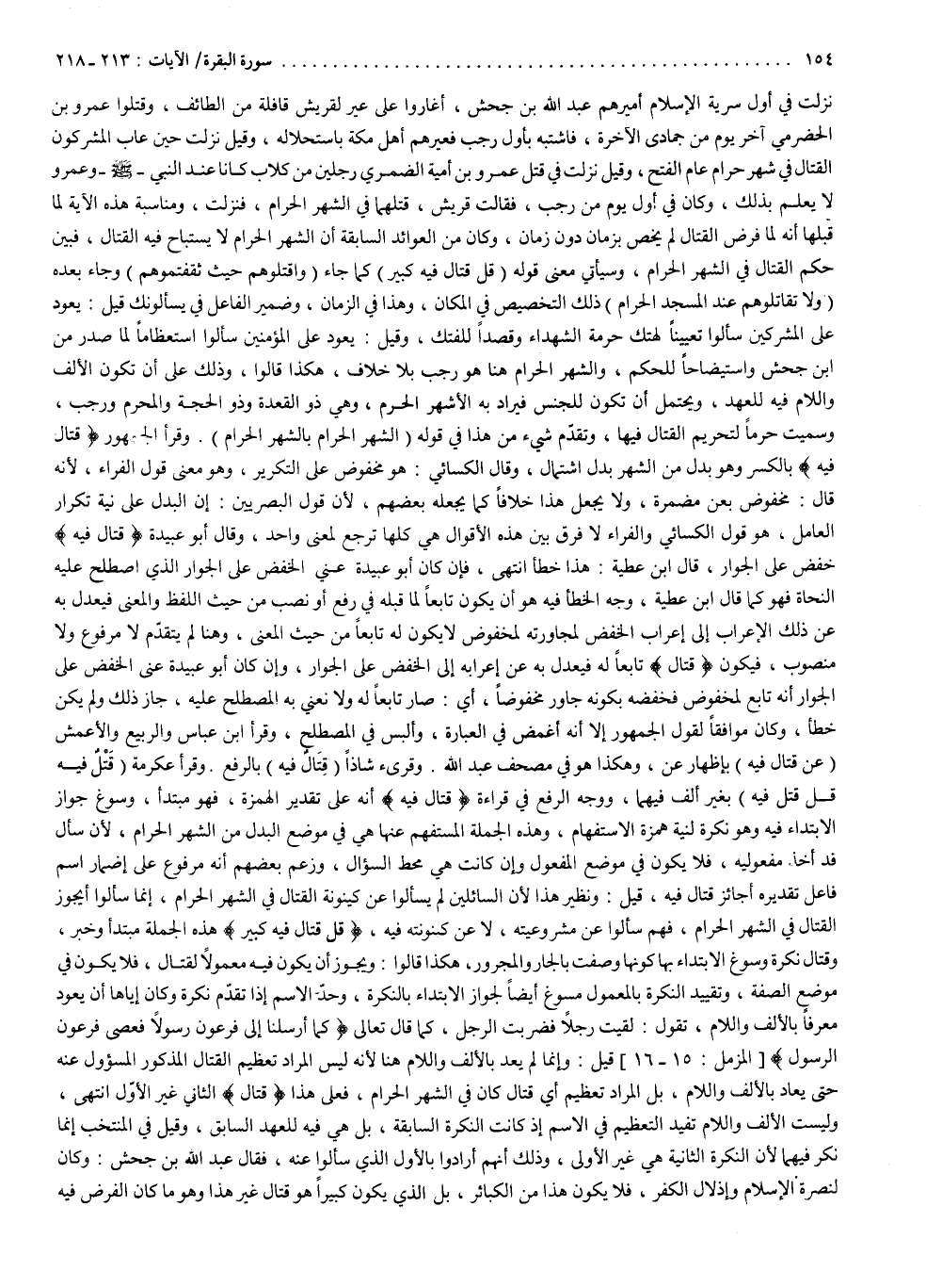( قُلْ قِتَالٌ فِيهِ كَبِيرٌ ( هذه الجملة مبتدأ وخبر ، و : قتال ، نكرة ، وسوغ الابتداء بها كونها وصفت بالجار والمجرور ، وهكذا قالوا ، ويجوز أن يكون : فيه ، معمولاً لقتال ، فلا يكون في موضع الصفة ، وتقييد النكرة بالمعمول مسوغ أيضاً لجواز الابتدا بالنكرة ، وحدّ الاسم إذا تقدّم نكرة ، وكان إياها ، أن يعود معرفاً بالألف واللام ، تقول : لقيت رجلاً فضربت الرجل ، كما قال تعالى : ) كَمَا أَرْسَلْنَا إِلَى فِرْعَوْنَ رَسُولاً فَعَصَى فِرْعَوْنُ الرَّسُولَ ( قيل : وإنما لم يعد بالألف واللام هنا لأنه ليس المراد تعظيم القتال المذكور المسئول عنه . حتى يعاد بالألف واللام ، بل المراد تعظيم : أي قتال كان في الشهر الحرام ، فعلى هذا : قتال الثاني ، غير الأوّل انتهى .