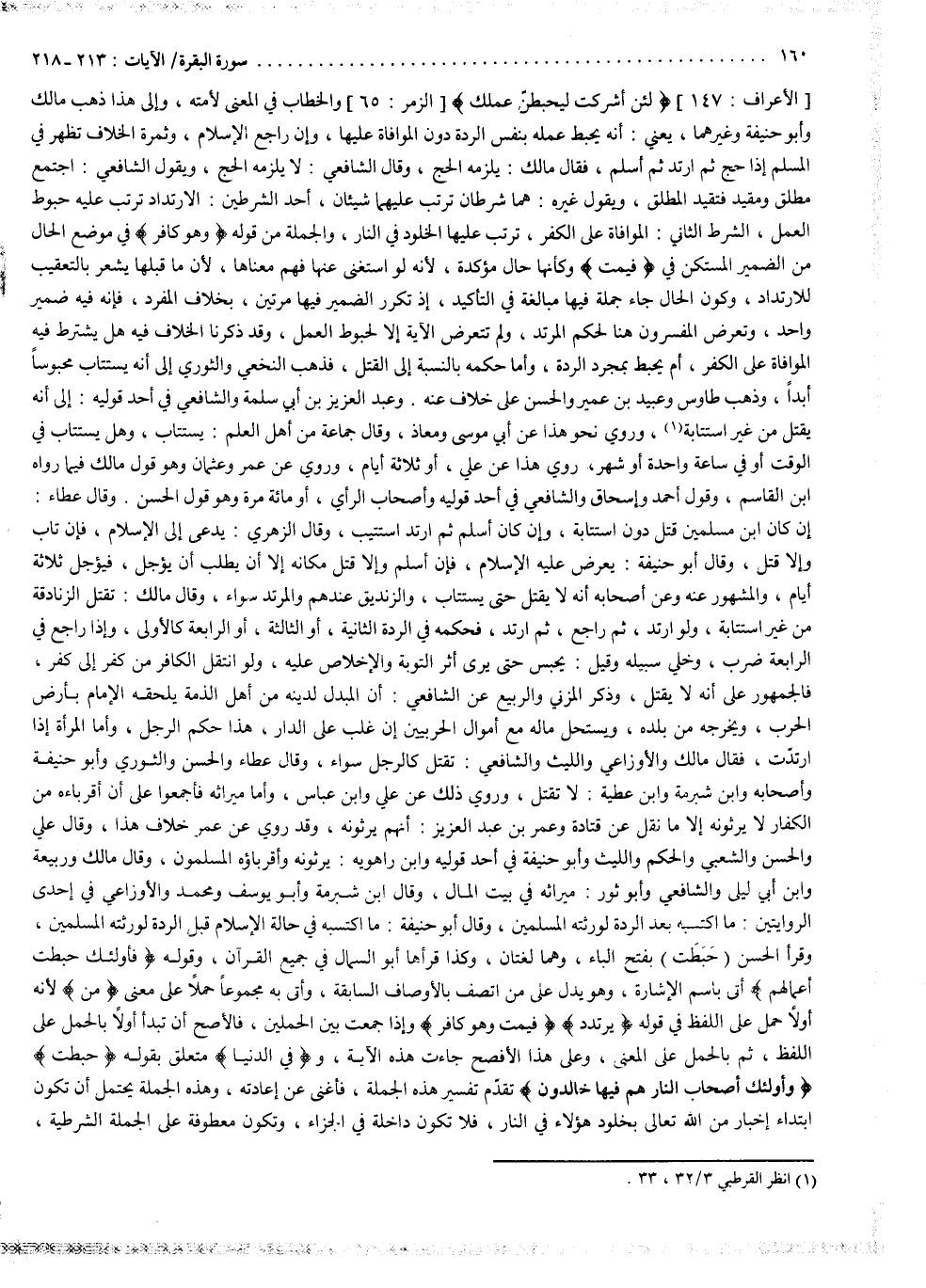 وتعرض المفسرون هنا لحكم المرتد ، ولم تتعرض الآية إلاَّ لحبوط العمل ، وقد ذكرنا الخلاف فيه هل يشترط فيه الموافاة على الكفر أم يحبط بمجرد الردة ؟ وأما حكمه بالنسبة إلى القتل ، فذهب النخعي والثوري : إلى أنه يستتاب محبوساً أبداً ، وذهب طاووس ، وعبيد بن عمير ، والحسن ، على خلاف عنه ، وعبد العزيز بن أبي سلمة ، والشافعي : في أحد قوليه ، إلى أنه يقتل من غير استتابة . وروي نحو هذا عن أبي موسى ، ومعاذ ، وقال جماعة من أهل العلم : يستتاب ، وهل يستتاب في الوقت ؟ أو في ساعة واحدة ؟ أو شهر ؟ روي هذا عن علي ، أو ثلاثة أيام ؟ وروي عن عمر ، وعثمان ، وهو قول مالك فيما رواه ابن القاسم ، وقول أحمد ، وإسحاق ، والشافعي ، في أحد قوليه ، وأصحاب الرأي : أو مائة مرة ؟ وهو قول الحسن .