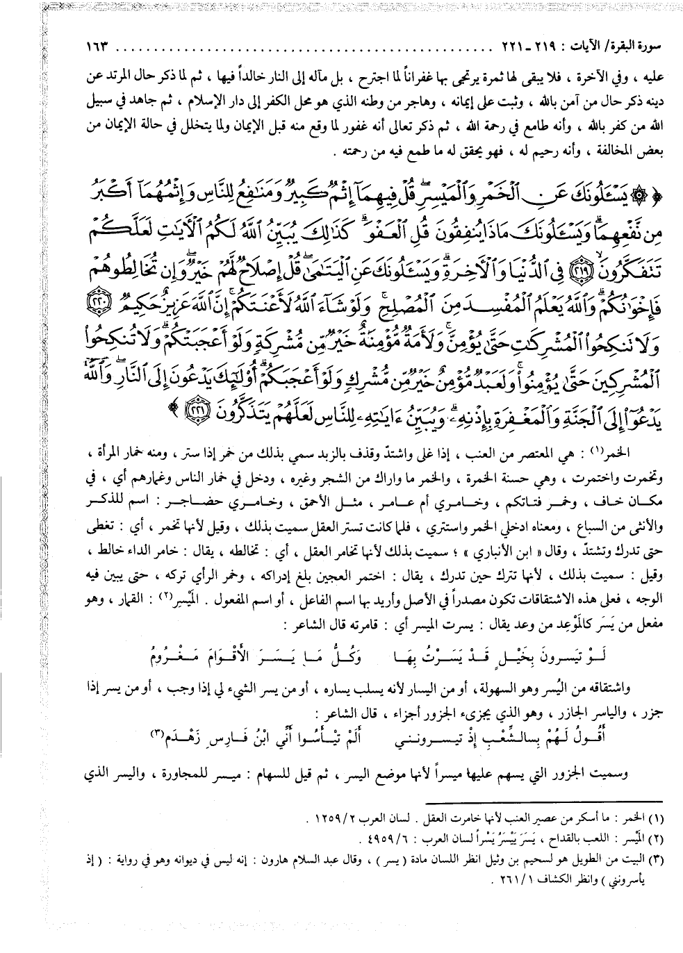 2 ( ) يَسْألُونَكَ عَنِ الْخَمْرِ وَالْمَيْسِرِ قُلْ فِيهِمَآ إِثْمٌ كَبِيرٌ وَمَنَافِعُ لِلنَّاسِ وَإِثْمُهُمَآ أَكْبَرُ مِن نَّفْعِهِمَا وَيَسْألُونَكَ مَاذَا يُنفِقُونَ قُلِ الْعَفْوَ كَذالِكَ يُبيِّنُ اللَّهُ لَكُمُ الآيَاتِ لَعَلَّكُمْ تَتَفَكَّرُونَ فِى الدُّنْيَا وَالاٌّ خِرَةِ وَيَسْألُونَكَ عَنِ الْيَتَامَى قُلْ إِصْلاَحٌ لَّهُمْ خَيْرٌ وَإِن تُخَالِطُوهُمْ فَإِخْوَانُكُمْ وَاللَّهُ يَعْلَمُ الْمُفْسِدَ مِنَ الْمُصْلِحِ وَلَوْ شَآءَ اللَّهُ لأَعْنَتَكُمْ إِنَّ اللَّهَ عَزِيزٌ حَكِيمٌ وَلاَ تَنْكِحُواْ الْمُشْرِكَاتِ حَتَّى يُؤْمِنَّ وَلأَمَةٌ مُّؤْمِنَةٌ خَيْرٌ مِّن مُّشْرِكَةٍ وَلَوْ أَعْجَبَتْكُمْ وَلاَ تُنكِحُواْ الْمُشِرِكِينَ حَتَّى يُؤْمِنُواْ وَلَعَبْدٌ مُّؤْمِنٌ خَيْرٌ مِّن مُّشْرِكٍ وَلَوْ أَعْجَبَكُمْ أُوْلَائِكَ يَدْعُونَ إِلَى النَّارِ وَاللَّهُ يَدْعُواْ إِلَى الْجَنَّةِ وَالْمَغْفِرَةِ بِإِذْنِهِ وَيُبَيِّنُ آيَاتِهِ لِلنَّاسِ لَعَلَّهُمْ يَتَذَكَّرُونَ وَيَسْألُونَكَ عَنِ الْمَحِيضِ قُلْ هُوَ أَذًى فَاعْتَزِلُواْ النِّسَآءَ فِي الْمَحِيضِ وَلاَ تَقْرَبُوهُنَّ حَتَّى يَطْهُرْنَ فَإِذَا تَطَهَّرْنَ فَأْتُوهُنَّ مِنْ حَيْثُ أَمَرَكُمُ اللَّهُ إِنَّ اللَّهَ يُحِبُّ التَّوَابِينَ وَيُحِبُّ الْمُتَطَهِّرِينَ نِسَآؤُكُمْ حَرْثٌ لَّكُمْ فَأْتُواْ حَرْثَكُمْ أَنَّى شِئْتُمْ وَقَدِّمُواْ لاًّنفُسِكُمْ وَاتَّقُواْ اللَّهَ وَاعْلَمُواْ أَنَّكُم مُّلَاقُوهُ وَبَشِّرِ الْمُؤْمِنِينَ ( ) ) 2