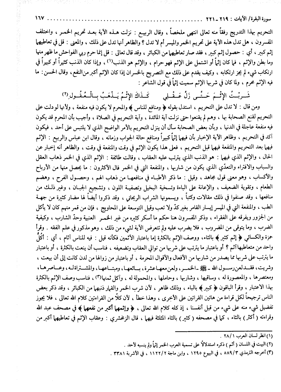 وقرأ الباقون : كبير ، بالباء ، وذلك ظاهر ، لأن شرب الخمر والقمار ذنبهما من الكبائر ، وقد ذكر بعض الناس ترجيحاً لكل قراءة من هاتين القراءتين على الأخرى ، وهذا خطأ ، لأن كلاً من القراءتين كلام الله تعالى ، فلا يجوز تفضيل شيء منه على شيء من قبل أنفنسا ، إذ كله كلام الله تعالى .