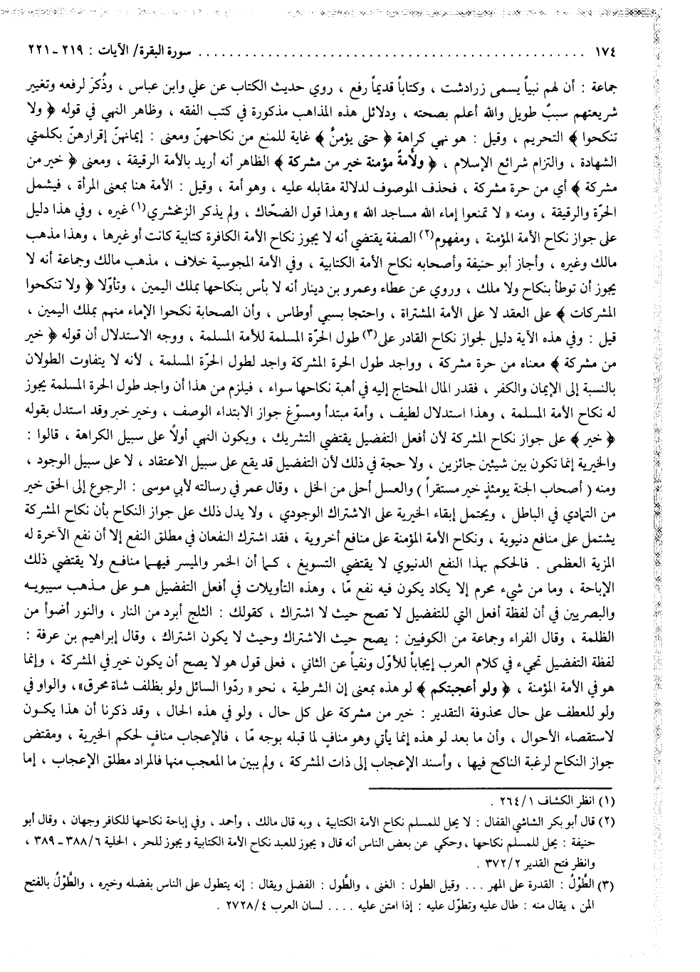 ( وَلامَةٌ مُّؤْمِنَةٌ خَيْرٌ مّن مُّشْرِكَةٍ ( الظاهر أنه أريد بالأمة الرقيقة ، ومعنى : خير من مشركة ، أي : من حرة مشركة ، فحذف الموصوف لدلالة مقابله عليه ، وهو أمة ، وقيل : الأمة هنا بمعنى بالمرأة ، فيشمل الحرّة والرقيقة ، ومنه : ( لا تمنعوا إماء الله مساجد الله ) . وهذا قول الضحاك : ولم يذكر الزمخشري غيره ، وفي هذا دليل على جواز نكاح الأمُّة المؤمنة ، ومفهوم الصفة يقتضي أنه لا يجوز نكاح الأمة الكافرة ، كتابية كانت أو غيرها ، وهذا مذهب مالك وغيره ؛ وأجاز أبو حنيفة وأصحابه نكاح الأمة المجوسية خلاف : مذهب مالك وجماعة أنه لا يجوز أن توطأ بنكاح ولا ملك ، وروي عن عطاء ، وعمرو بن دينار أنه لا بأس بنكاحها بملك اليمين ، وتأولاً : ) وَلاَ تَنْكِحُواْ الْمُشْرِكَاتِ ( على العقد لا على الأمة المشتراة ، واحتجَّا بسبي أوطاس ، وأن الصحابة نكحوا الإماء منهم بملك اليمين .