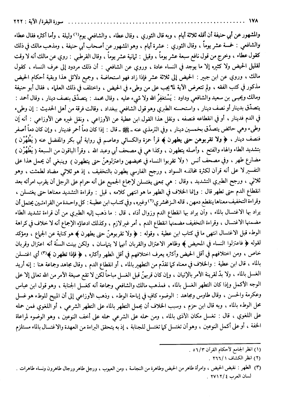 وفي كتاب ابن عطية : كل واحد من القراءتين يحتمل أن يراد بها الاغتسال بالماء ، وأن يراد بها انقطاع الدم وزوال أذاه ، قال : وما ذهب إليه الطبري من أن قراءة تشديد الطاء مضمنها الاغتسال ، وقراءة التخفيف مضمنها إنقطاع الدم أمر غير لازم ، وكذلك ادعاؤه الإجماع أنه لا خلاف في كراهة الوطء قبل الاغتسال . انتهى ما في كتاب ابن عطية .