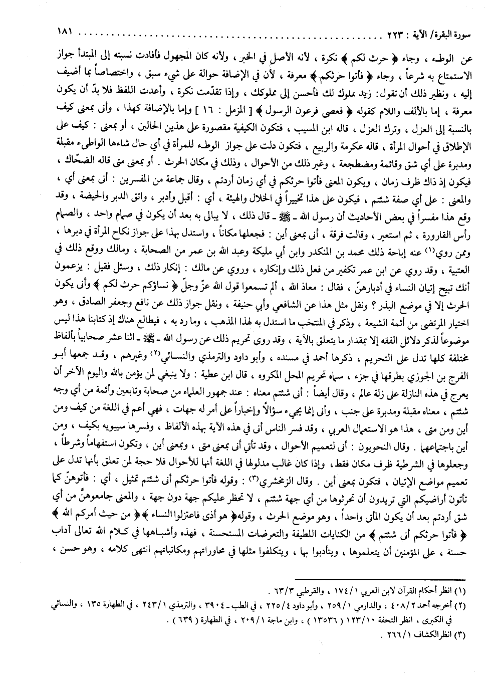 قال ابن عطية : ولا ينبعغي لمن يؤمن بالله واليوم الآخر أن يعرج في هذه النازلة على زلة عالم ، وقال أيضاً : أنى شئتم ، معناه عند جمهور العلماء من : صحابة ، وتابعين ، وأئمة : من أي وجه شئتم ، معناه : مقبلة ومدبرة على جنب ، وأنَّى : إنما يجيء سؤالاً وإخبارطاً على أمر له جهات ، فهي أعخم في اللغة من : كيف ، ومن : أين ، ومن : متى . هذا هو الاستعمال العربي .
