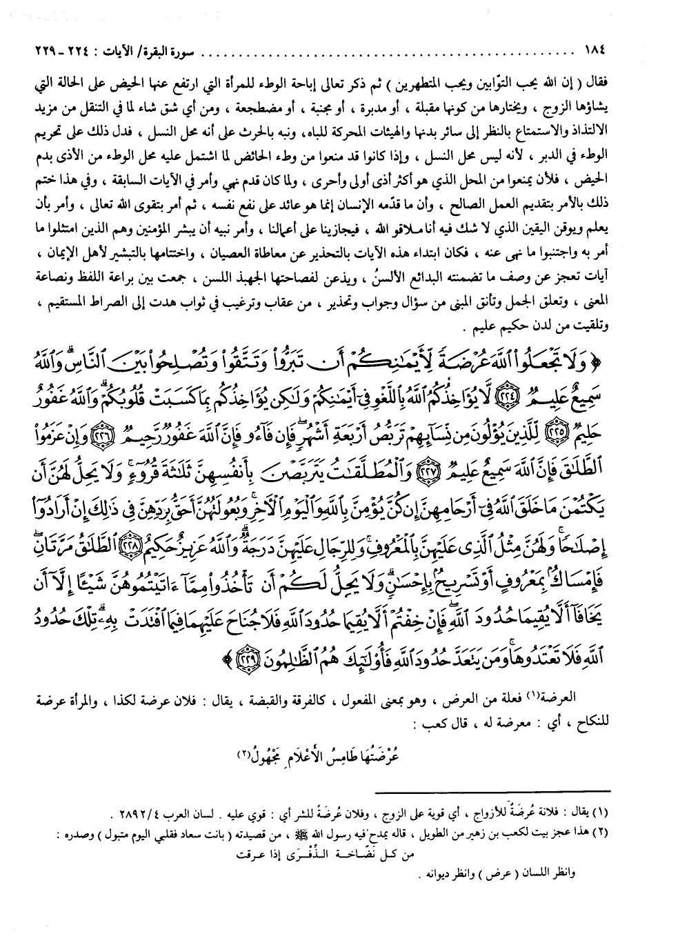 2 ( ) وَلاَ تَجْعَلُواْ اللَّهَ عُرْضَةً لاًّيْمَانِكُمْ أَن تَبَرُّواْ وَتَتَّقُواْ وَتُصْلِحُواْ بَيْنَ النَّاسِ وَاللَّهُ سَمِيعٌ عَلِيمٌ لاَّ يُؤَاخِذُكُمُ اللَّهُ بِالَّلغْوِ فِىأَيْمَانِكُمْ وَلَاكِن يُؤَاخِذُكُم بِمَا كَسَبَتْ قُلُوبُكُمْ وَاللَّهُ غَفُورٌ حَلِيمٌ لِّلَّذِينَ يُؤْلُونَ مِن نِّسَآئِهِمْ تَرَبُّصُ أَرْبَعَةِ أَشْهُرٍ فَإِن فَآءُوا فَإِنَّ اللَّهَ غَفُورٌ رَّحِيمٌ وَإِنْ عَزَمُواْ الطَّلَاقَ فَإِنَّ اللَّهَ سَمِيعٌ عَلِيمٌ وَالْمُطَلَّقَاتُ يَتَرَبَّصْنَ بِأَنْفُسِهِنَّ ثَلَاثَةَ قُرُوءٍ وَلاَ يَحِلُّ لَهُنَّ أَن يَكْتُمْنَ مَا خَلَقَ اللَّهُ فِىأَرْحَامِهِنَّ إِن كُنَّ يُؤْمِنَّ بِاللَّهِ وَالْيَوْمِ الاٌّ خِرِ وَبُعُولَتُهُنَّ أَحَقُّ بِرَدِّهِنَّ فِي ذَالِكَ إِنْ أَرَادُواْ إِصْلَاحاً وَلَهُنَّ مِثْلُ الَّذِى عَلَيْهِنَّ بِالْمَعْرُوفِ وَلِلرِّجَالِ عَلَيْهِنَّ دَرَجَةٌ وَاللَّهُ عَزِيزٌ حَكُيمٌ الطَّلَاقُ مَرَّتَانِ فَإِمْسَاكٌ بِمَعْرُوفٍ أَوْ تَسْرِيحٌ بِإِحْسَانٍ وَلاَ يَحِلُّ لَكُمْ أَن تَأْخُذُواْ مِمَّآ ءَاتَيْتُمُوهُنَّ شَيْئًا إِلاَّ أَن يَخَافَآ أَلاَّ يُقِيمَا حُدُودَ اللَّهِ فَإِنْ خِفْتُمْ أَلاَّ يُقِيمَا حُدُودَ اللَّهِ فَلاَ جُنَاحَ عَلَيْهِمَا فِيمَا افْتَدَتْ بِهِ تِلْكَ حُدُودُ اللَّهِ فَلاَ تَعْتَدُوهَا وَمَن يَتَعَدَّ حُدُودَ اللَّهِ فَأُوْلَائِكَ هُمُ الظَّالِمُونَ ( ) ) 2