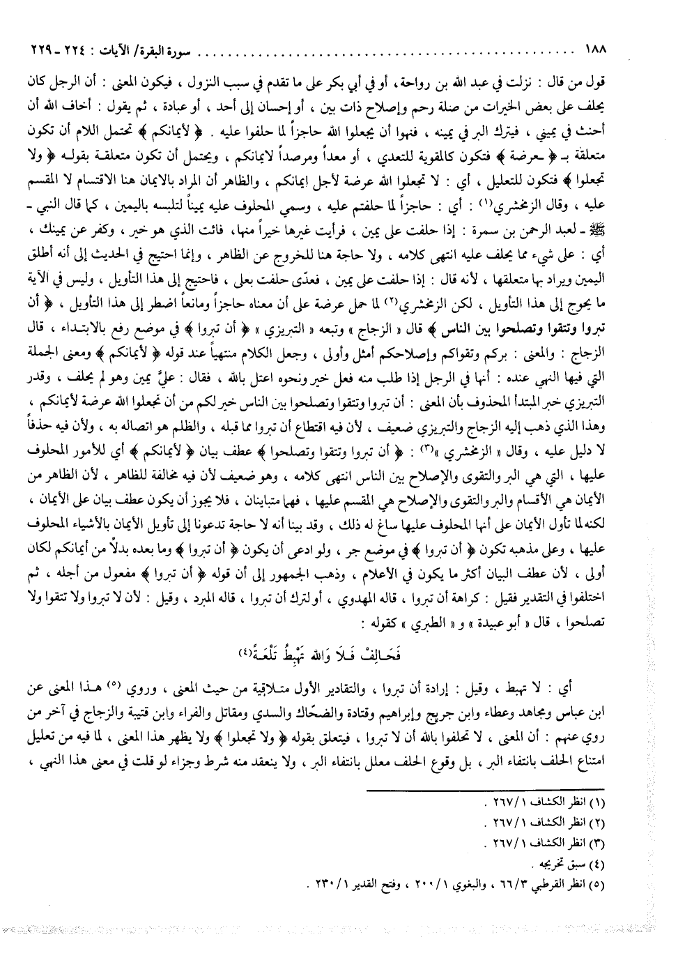 ( أَن تَبَرُّواْ وَتَتَّقُواْ وَتُصْلِحُواْ بَيْنَ النَّاسِ ( قال الزجاج ، وتبعه التبريزي : أن تبروا ، في موضع رفع بالابتداء ، قال الزجاج والمعنى : بركم وتقواكم وإصلاحكم أمثل وأولى ، وجعل الكلام منتهياً عند قوله : لأيمانكم ، ومعنى الجملة التي فيها النهي عنده أنها في الرجل إذا طلب منه فعل خير ونحوه اعتل بالله ، فقال : علي يمين ، وهو لم يحلف ، وقدر التيريزي خبر المبتدأ المحذوف بأن المعنى : أن تبروا وتتقوا وتصلحوا بين الناس خير لكم من أن تجعلوا الله عرضة لأيمانكم ، وهذا الذي ذهب إليه الزجاج والتبريزي ضعيف ، لأن فيه اقتطاع : أن تبروا ، مما قبله ، والظلم هو اتصاله به ، ولأن فيه حذفاً لا دليل عليه وقال الزمخشري : أن تبروا وتتقوا وتصلحوا ، عطف بيان لأيمانكم ، أي للأمور المحلوف عليها التي هي : البر والتقوى والإصلاح بين الناس إنتهى كلامه وهو ضعيف ، لأن فيه مخالفة للظاهر ، لأن الظاهر من الأيمان هي الأقسام ، والبر والتقوى والإصلاح هي المقسم عليها ، فهما متباينان ، فلا يجوز أن يكون عطف بيان على الإيمان ، لكنه لما تأول الأيمان على أنها المحلوف عليها ، ساغ له ذلك ، وقد بينا أنه لا حاجة تدعونا إلى تأويل الأيمان بالأشياء المحلوف عليها ، وعلى مذهبه تكون : أن تبروا ، في موضع جر ، ولو أدعى أن يكون : أن تبروا ، وما بعده بدلاً من : أيمانكم ، لكان أولى ، لأن عطف البيان أكثر ما يكون في الأعلام .
