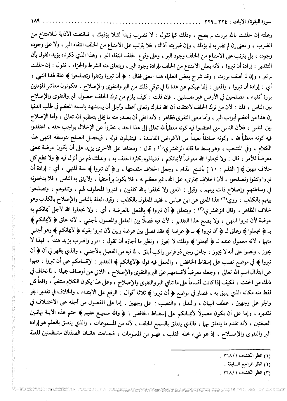 وعلته : إن حلفت بالله بررت ، لم يصح وذلك كما تقول : لا تضرب زيداً لئلا يؤذك ، فانتفت الاذاية للامتناع من الضرب ، والمعنى : إن لم تضربه لم يؤذيك ، وإن ضربته أذاك ، فلا يترتب على الامتناع من الحلف انتفاء البر ، ولا على وجوده ، بل يترتب على الامتناع من الحلف وجود البر ، وعلى وقوع الحلف انتفاء البر ، وهذا الذي ذكرناه يؤيد القول بان التقدير : إرادة أن تبروا ، لأنه لا يعلل الامتناع من الحلف بإرادة وجود البر ، ويتعلق منه الشرط والجزاء ، تقول : إن حلفت لم تبر ، وإن لم تحلف بررت .