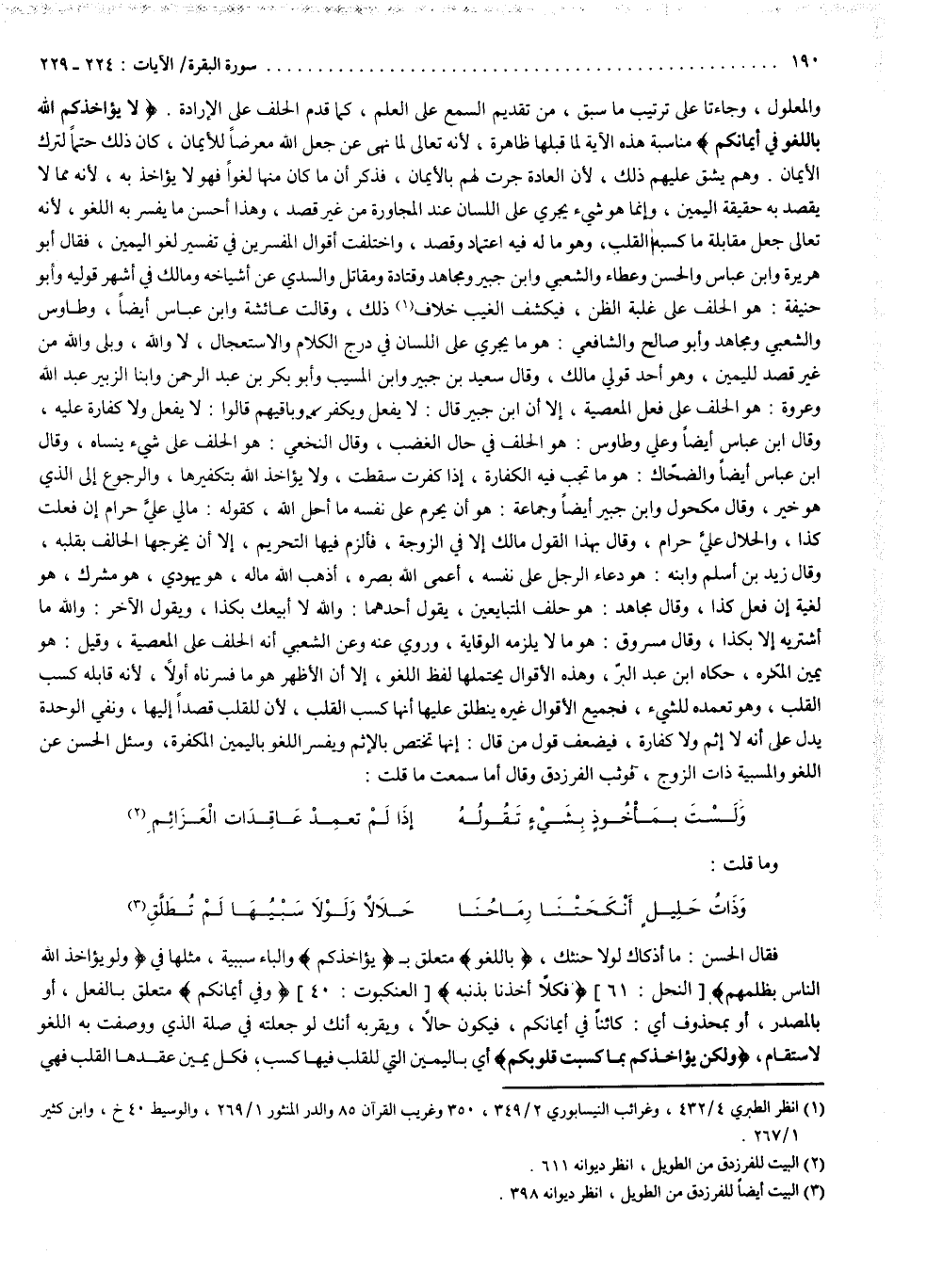 وهذه الأقوال يحتملها لفظ اللغو ، إلاَّ أن الأظهر هو ما فسرناه أولاً ، لأنه قابله كسب القلب ، وهو تعمده للشيء ، فجميع الأقوال غيره ينطبق عليها أنها كسب القلب ، لأن للقلب قصداً إليها : ونفي الوحدة يدل على أنه لا إثم ولا كفارة ، فيضعف قول من قال : إنها تختص بالإثم ، ويفسر اللغو باليمين المكفرة ، وسئل الحسن عن اللغو ، والمسبية ذات الزوج ، فوثب الفرزدق وقال : أما سمعت ما قلت : ولست بمأخوذ بشيء تقوله