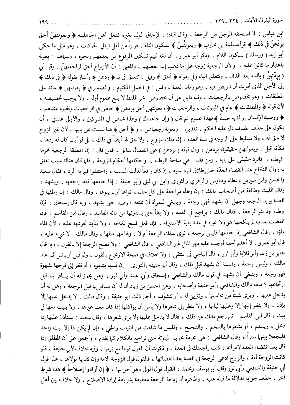 وقرأ أبي : بردتهِنَّ بالتاء بعد الدال ، وتتعلق : الباء ، وفي ، بقوله : أحق ، وقيل : تتعلق : في ، بردهنّ ؛ وأشار بقوله : في ذلك ، إلى الأجل الذي أمرت أت تتربص فيه ، وهو زمان العدة وقيل : في الحمل المكتوم ، والضمير في : بعولتهن ، عائد على المطلقات ، وهو مخصوص بالرجعيات ، وفيه دليل على أن خصوص آخر اللفظ لا يمنع عموم أوله ولا يوجب تخصيصه ، لأن قوله : والمطلقات ، عام في المبتوتات والرجعيات ، و : بعولتهن أحق بردهن ، خاص في الرجعيات ، ونظيره عندهم ) وَصَّيْنَا الإِنْسَانَ بِوَالِدَيْهِ حُسْناً ( فهذا عموم ، ثم قال : ) وَإِن جَاهَدَاكَ ( وهذا خاص في المشركين .