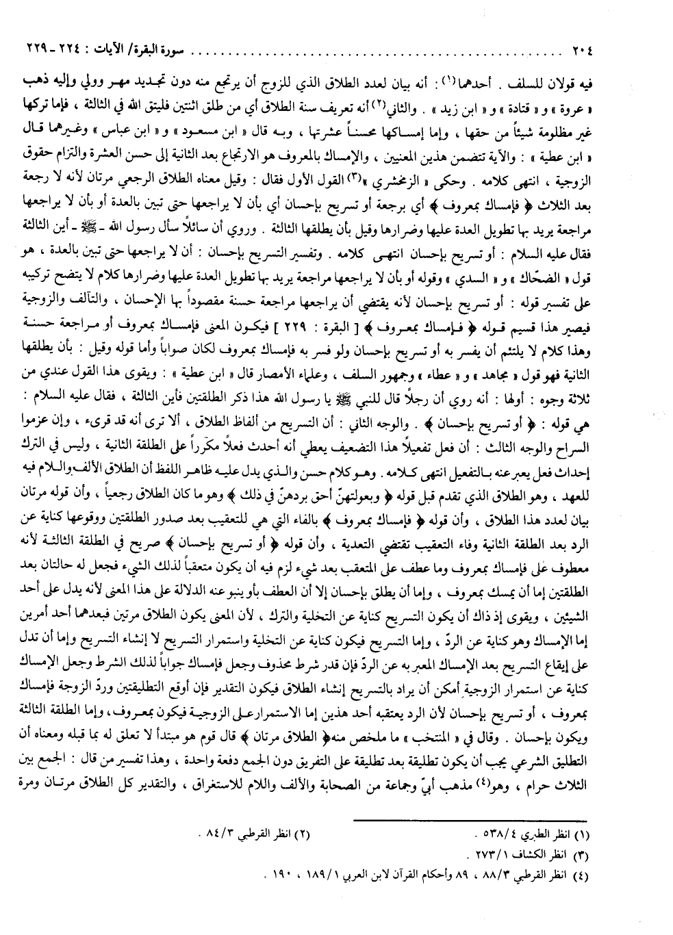 وتفسير : التسريح بإحسان ، أن لا يراجعها حتى تبين بالعدة ، هو قول الضحاك ، والسدي . وقوله : أو بأن لا يراجعها مراجعة يريد بها تطويل العدة عليها وضرارها ، كلام لا يتضح تركيبه على تفسير قوله : أو تسريح بإحسان ، لأنه يقتضي أن يراجعها مراجعة حسنة مقصوداً بها الإحسان والتآلف والزوجية ، فيصير هذا قسيم قوله : ) فَإِمْسَاكٌ بِمَعْرُوفٍ ( فيكون المعنى : فامساك بمعروف أو مراجعة مراجعة حسنة . وهذا كلام لا يلتئم أن يفسر به ) أَوْ تَسْرِيحٌ بِإِحْسَانٍ ( ولو فسر به فإمساك بمعروف لكان صواباً . وأما قوله : وقيل بأن يطلقها الثالثة ، فهو قول مجاهد وعطاء وجمهور السلف ، وعلماء الأمصار .