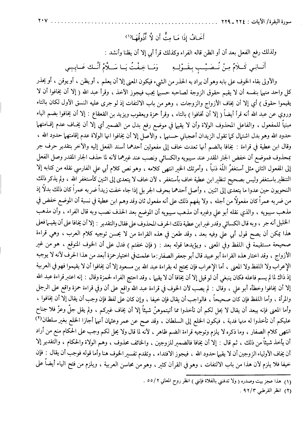 وقال ابن عطية : في قراءة يخافا بالضم ، أنها تعدت خاف إلى مفعولين : أحدهما أسند الفعل إليه ، والآخر بتقدير حرف جر بمحذوف ، فموضع أن خفض الجار المقدر عند سيبويه ، والكسائي ، ونصب عند غيرهما ، لأنه لما حذف الجار المقدر وصل الفعل إلى المفعول الثاني ، مثل : استغفر لله ذنباً ، وأمرتك الخير . إنتهى كلامه . وهو نص كلام أبي علي الفارسي نقله من كتابه ، إلا التنظير باستغفر ، وليس بصحيح تنظير ابن عطية خاف باستغفر ، لأن خاف لا يتعدى إلى اثنين ، كاستغفر الله ، ولم يذكر ذلك النحويون حين عدوا ما يتعدى إلى اثنين ، وأصل أحدهما بحرف الجر ، بل إذا جاء : خفت زيداً ضربه عمراً ، كان ذلك بدلاً ، إذ : من ضربه عمراً كان مفعولاً من أجله ، ولا يفهم ذلك على أنه مفعول ثان ، وقد وهم ابن عطية في نسبة أن الموضع خفض في مذهب سيبويه ، والذي نقله أبو علي وغيره أن مذهب سيبويه أن الموضع بعد الحذف نصب ، وبه قال الفراء ، وأن مذهب الخليل أنه جر ، وبه قال الكسائي . وقدَّر غير ابن عطية ذلك الحرف المحذوف : على ، فقال : والتقدير إلاَّ أن يخافا على أن يقيما ، فعلى هذا يمكن أن يصح قول علي وفيه بعد وقد طعن في هذه القراءات من لا يحسن توجيه كلام العرب ، وهي قراءة صحيحة مستقيمة في اللفظ وفي المعنى ، ويؤيدها قوله بعد : فإن خفتم ، فدل على أن الخوف المتوقع هو من غير الأزواج ، وقد اختار هذه القراءة أبو عبيد .