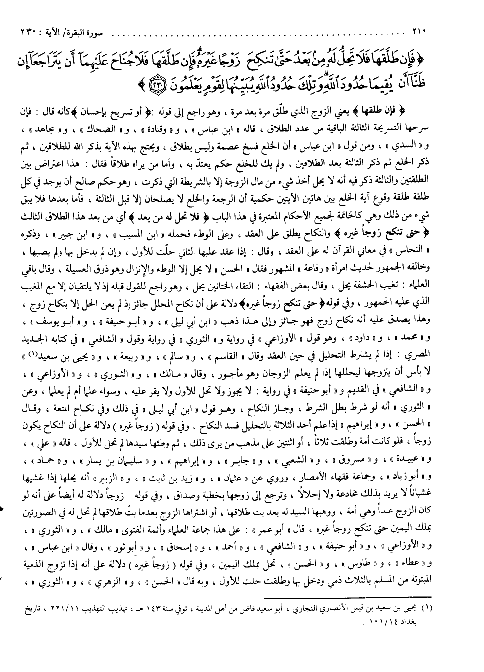 2 ( ) فَإِن طَلَّقَهَا فَلاَ تَحِلُّ لَهُ مِن بَعْدُ حَتَّى تَنْكِحَ زَوْجًا غَيْرَهُ فَإِن طَلَّقَهَا فَلاَ جُنَاحَ عَلَيْهِمَآ أَن يَتَرَاجَعَآ إِن ظَنَّآ أَن يُقِيمَا حُدُودَ اللَّهِ وَتِلْكَ حُدُودُ اللَّهِ يُبَيِّنُهَا لِقَوْمٍ يَعْلَمُونَ ( ) ) 2