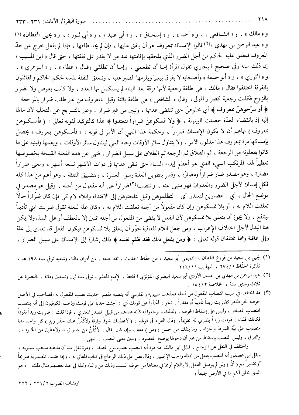 ( وَلاَ تُمْسِكُوهُنَّ ضِرَارًا لّتَعْتَدُواْ ( هذا كالتوكيد لقوله تعالى : ) فَأَمْسِكُوهُنَّ بِمَعْرُوفٍ ( نهاهم أن لا يكون الإمساك ضراراً ، وحكمة هذا النهي أن الأمر في قوله : ) فَأَمْسِكُوهُنَّ بِمَعْرُوفٍ ( يحصل بإمساكها مرة بمعروف ، هذا مدلول الأمر ، ولا يتناول سائر الأوقات وجاء النهي ليتناول سائر الأوقات ليعمها ، ولينبه على ما كانوا يفعلونه من الرجعة ، ثم الطلاق ، ثم الرجعة ، ثم الطلاق على سبيل الضرار ، فنهى عن هذه الفعلة القبيحة يخصوصها ، تعظيماً لهذا المرتكب الشيء الذي هو أعظم إيذاء النساء ، حتى تبقى عدتها في ذوات الأشهر تسعة أشهر .