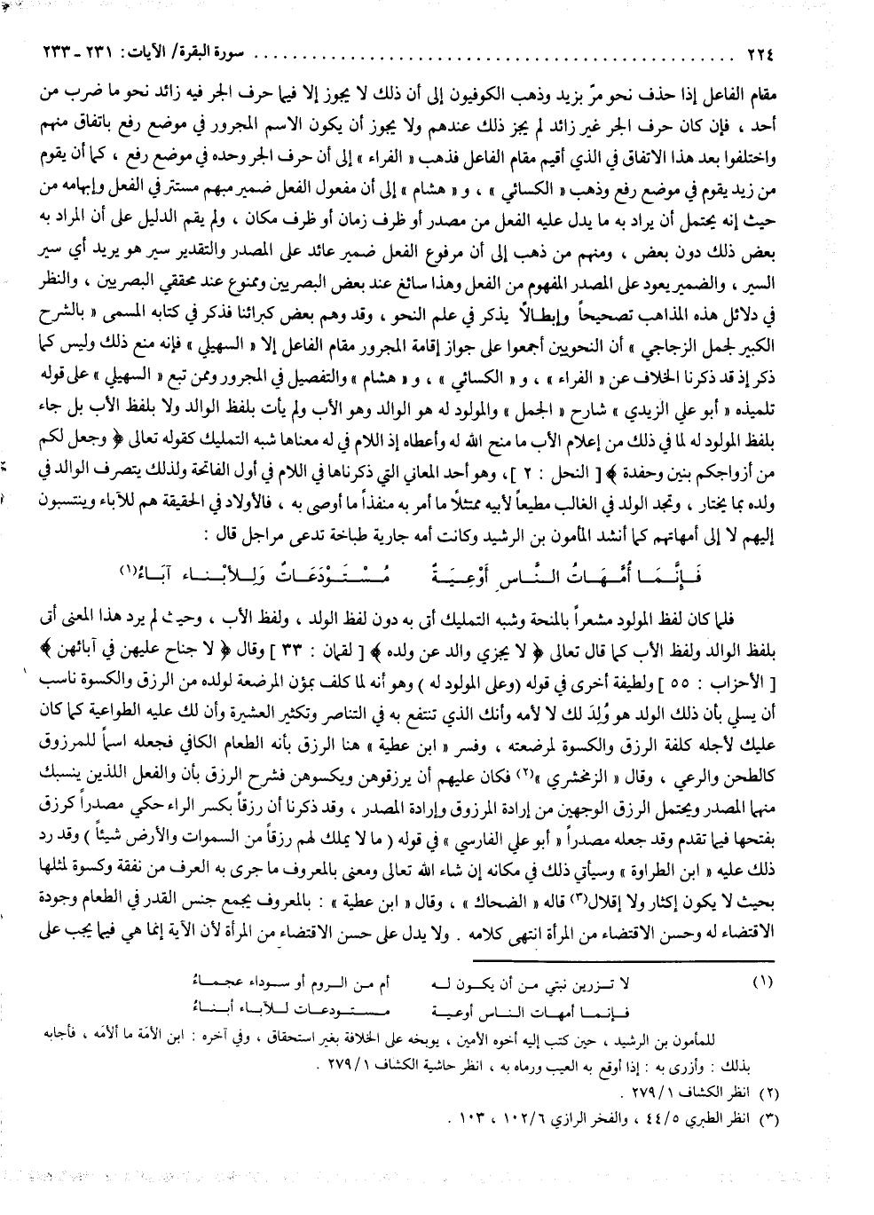 و : المولود له ، هو الوالد ، وهو الأب ، ولم يأت بلفظ الوالد ، ولا بلفظ الأب ، بل جاء بلفظ : المولود له ، لما في ذلك من إعلام الأب ما منح الله له وأعطاه ، إذ اللام في : له ، معناها شبه التمليك كقوله تعالى : ) وَجَعَلَ لَكُمْ مّنْ أَزْواجِكُم بَنِينَ وَحَفَدَةً ( وهو أحد المعاني التي ذكرناها في اللام في أول الفاتحة ، ولذلك يتصرف الوالد في ولده بما يختار ، وتجد الولد في الغالب مطيعاً لأبيه ، ممتثلاً ما أمر به ، منفذاً ما أوصى به ، فالأولاد في الحقيقة هم للآباء ، وينتسبون إليهم لا إلى أمهاتهم ، كما أنشد المأمون بن الرشيد ، وكانت أمه جارية طباخة تدعى مراجل ، قال : فإنما أمهات الناس أوعية