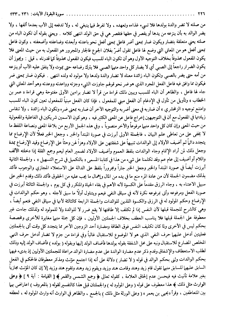 والجملة الرابعة : كالثالثة ، لأنها في سياق النفي ، فتعم أيضاً ، وهي كالشرح للجملة قبلها ، لأن النفس إذا لم تكلف إلاَّ طاقتها لا يقع ضرر لا للوالدة ولا للمولود له ، ولذلك جاءت غير معطوفة على الجملة قبلها ، فلا يناسب العطف بخلاف الجملتين الأوليين ، فإن كل جملة منهما مغايرة للأخرى ، ومخصصة بحكم ليس في الأخرى ، ولما كان تكليف النفس فوق الطاقة ، ومضارة أحد الزوجين الآخر مما يتجدد كل وقت ، أتى بالجملتين فعليتين ، أدخل عليهما حرف النفي الذي هو : لا ، الموضوع للاستقبال غالباً ، وفي قراءة من جزم : لا تضار ، أدخل حرف النهي المخلص المضارع للاستقبال ، ونبه على محل الشفقة بقوله : بولدها ، فأضاف الولد إليها ، وبقوله : بولده ، فأضاف الولد إليه ، وذلك لطلب الاستعطاف والإشفاق . وقدم ذكر عدم مضارة الوالدة على عدم مضارة الوالد مراعاة للجملتين الأوليين ، إذ بدىء فيهما بحكم الوالدات ، وثنى بحكم الوالد في قوله : لا تضار ، دلالة على أنه إذا اجتمع مؤنث ومذكر معطوفان ، فالحكم في الفعل السابق عليهما للسابق منهما ، تقول : قام زيد وهند وقامت هند وزيد ، ويقوم زيد وهند ، وتقوم هند وزيد ، إلاَّ إن كان المؤنث مجازياً بغير علامة تأنيث فيه فيحسن عدم إلحاق العلامة ، كقوله تعالى : ) وَجُمِعَ الشَّمْسُ وَالْقَمَرُ ).